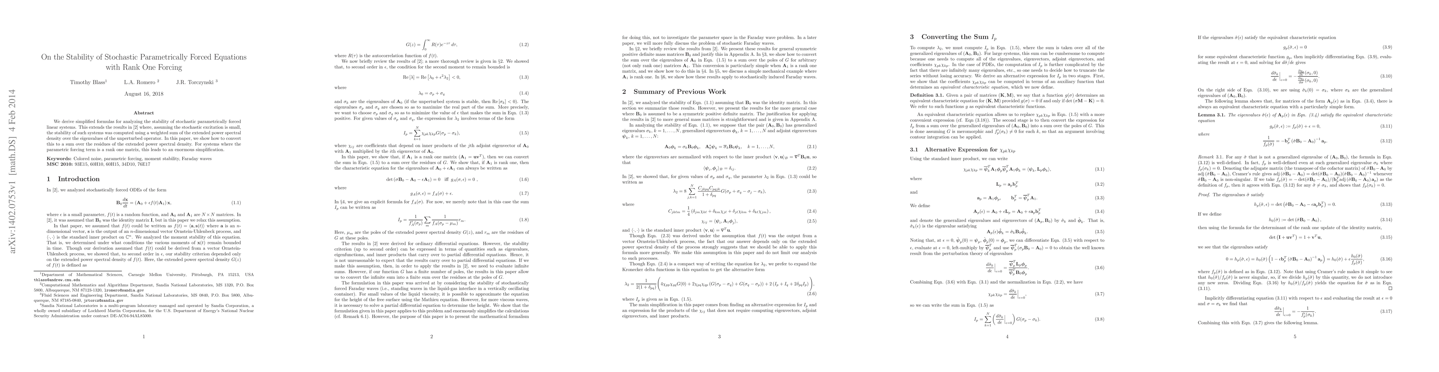 This paper presents simplified formulas for assessing the stability of stochastic parametrically forced linear systems, particularly when the forcing term is a rank one matrix. It converts the analysis from a weighted sum over eigenvalues to a sum over residues of the extended power spectral density, significantly simplifying the computation.