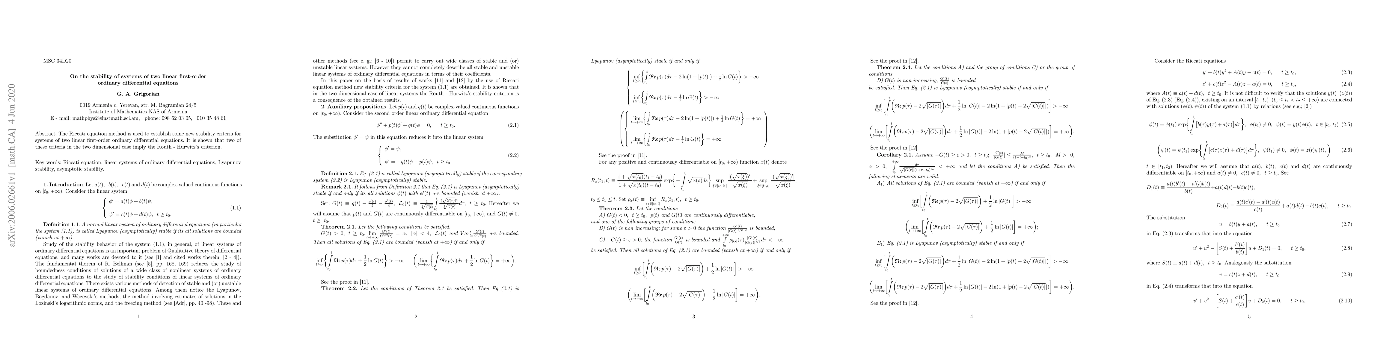 Summary: The paper employs the Riccati equation method to derive new stability criteria for two-dimensional systems of linear first-order ordinary differential equations, demonstrating that two of these criteria coincide with Routh-Hurwitz's criterion.