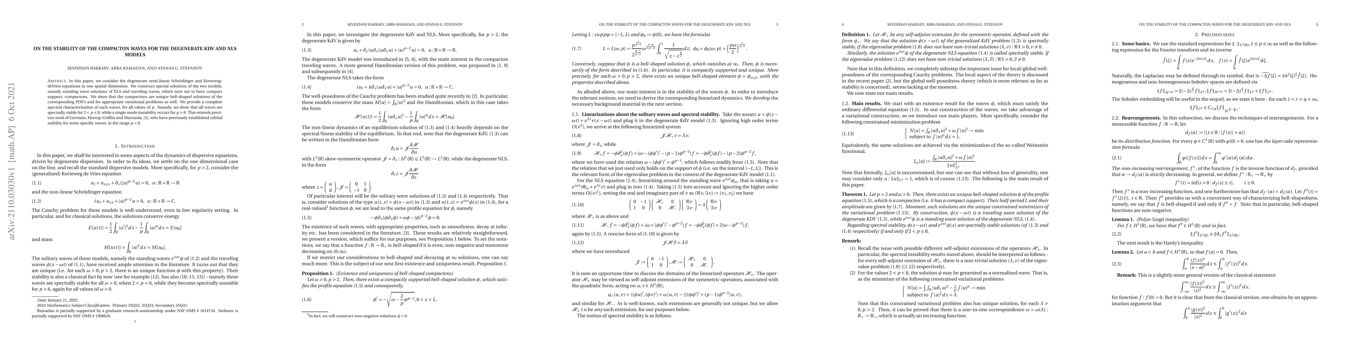This paper investigates stability of compacton waves in two degenerate models: KdV and NLS equations, showing spectral stability for $2<p leq 8$ and single mode instability for $p>8$.