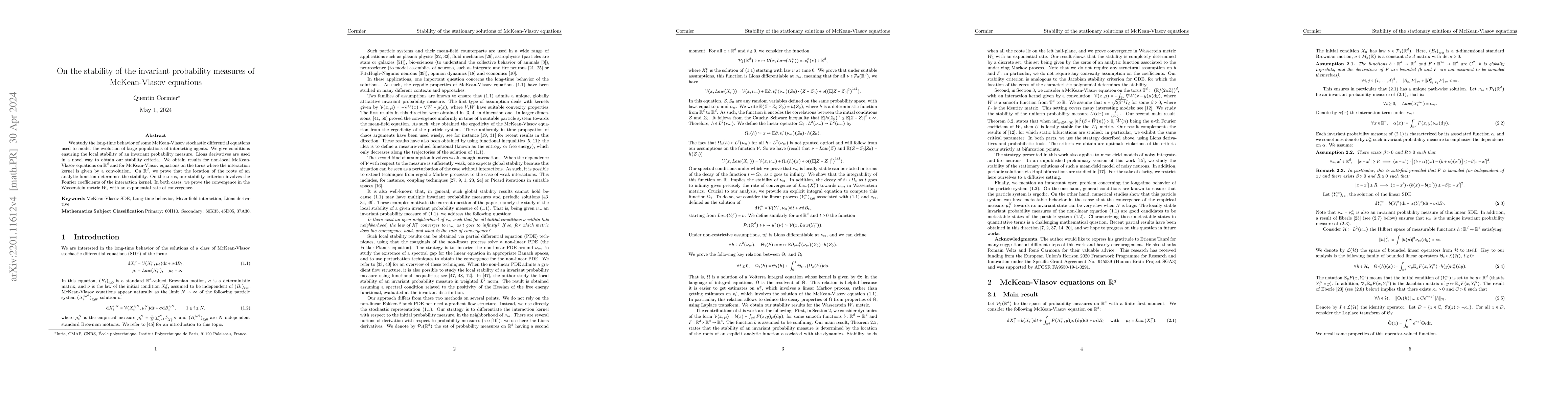 This paper investigates the stability of invariant probability measures for McKean-Vlasov equations, which model large populations of interacting agents. It establishes stability criteria using Lions derivatives and proves exponential convergence in the Wasserstein metric $W_1$, with stability determined by analytic function roots on $\mathbb{R}^d$ and Fourier coefficients on the torus.