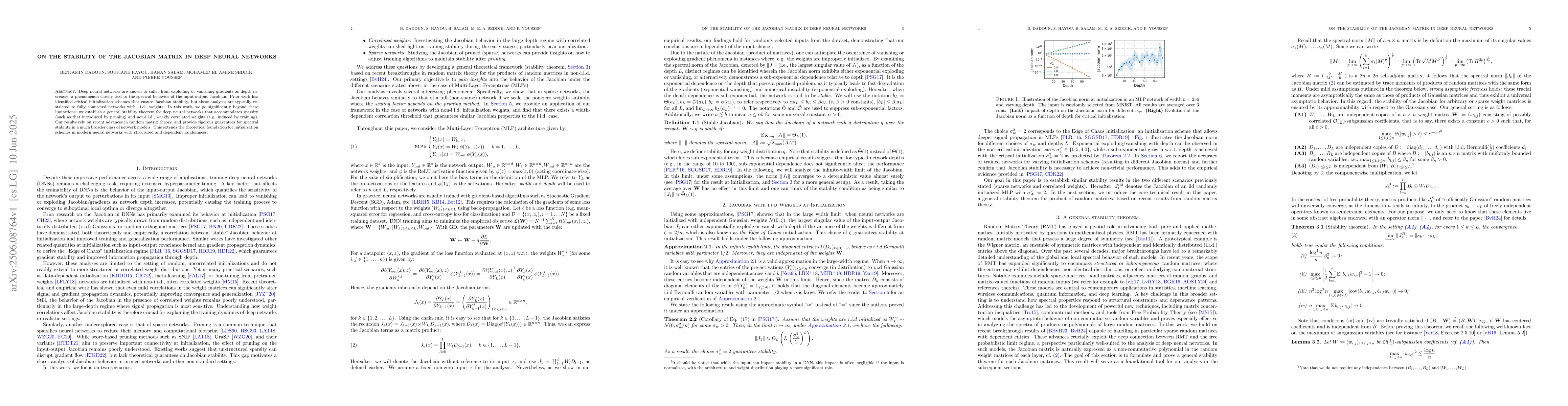Deep neural networks are known to suffer from exploding or vanishing gradients as depth increases, a phenomenon closely tied to the spectral behavior of the input-output Jacobian. Prior work has identified critical initialization schemes that ensure Jacobian stability, but these analyses are typically restricted to fully connected networks with i.i.d. weights. In this work, we go significantly beyond these limitations: we establish a general stability theorem for deep neural networks that accommodates sparsity (such as that introduced by pruning) and non-i.i.d., weakly correlated weights (e.g. induced by training). Our results rely on recent advances in random matrix theory, and provide rigorous guarantees for spectral stability in a much broader class of network models. This extends the theoretical foundation for initialization schemes in modern neural networks with structured and dependent randomness.