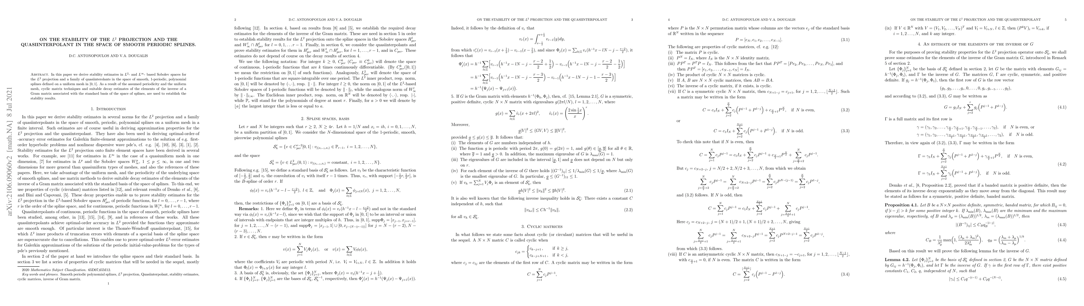 The paper derives stability estimates for $L^2$ projection and quasiinterpolants in a space of smooth periodic splines, showing they remain stable with proper mesh size and decay rates.