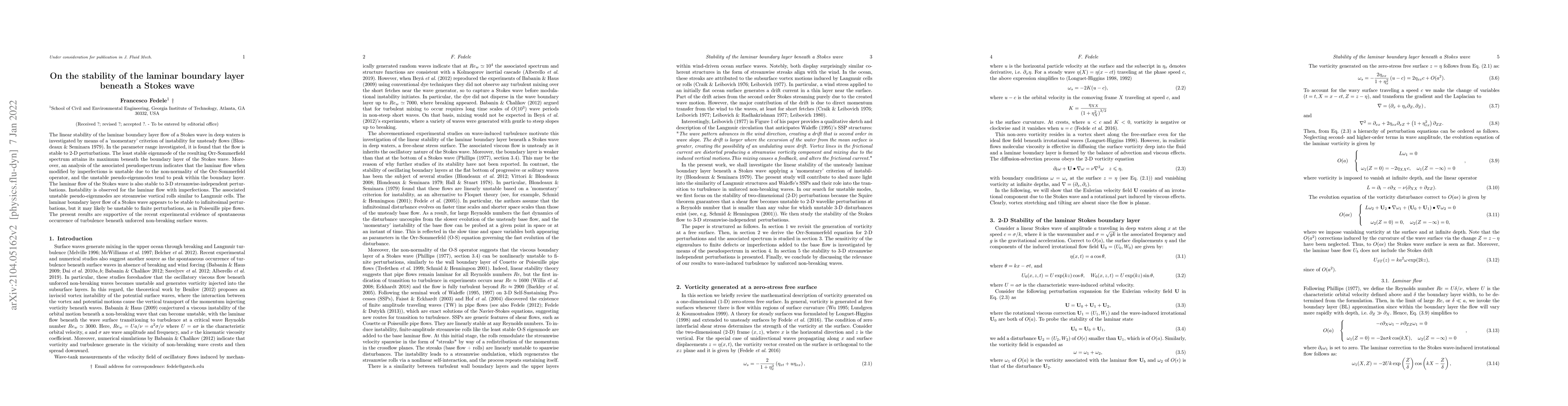 This paper investigates the linear stability of the laminar boundary layer beneath a Stokes wave, finding that it is stable to 2-D and 3-D perturbations. However, it suggests that imperfections may induce instability due to non-normality, supporting experimental evidence of turbulence beneath surface waves.