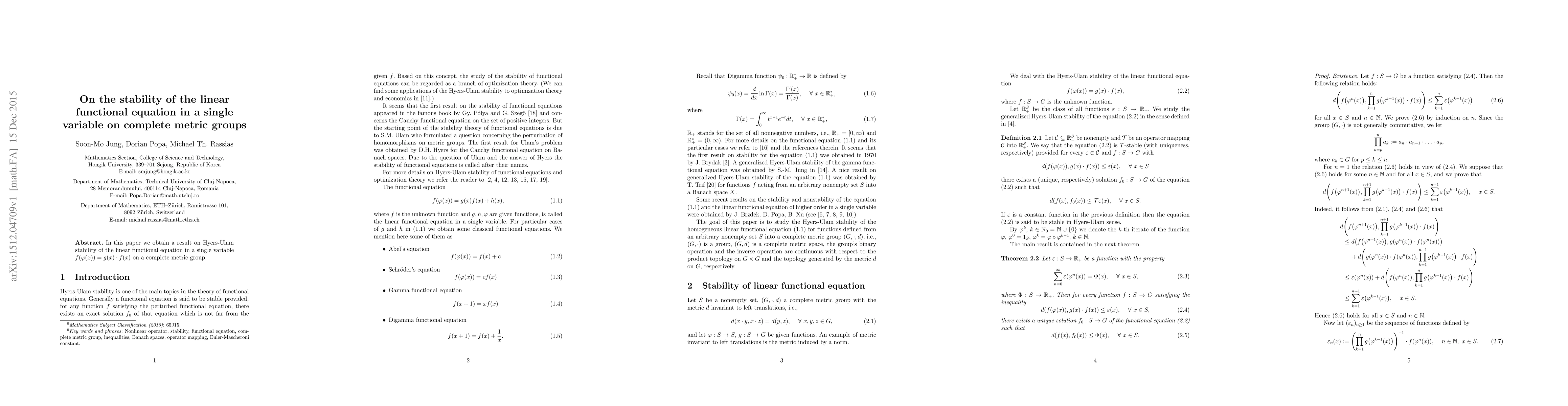 In this paper we obtain a result on Hyers-Ulam stability of the linear functional equation in a single variable $f(\varphi(x)) = g(x) \cdot f(x)$ on a complete metric group.