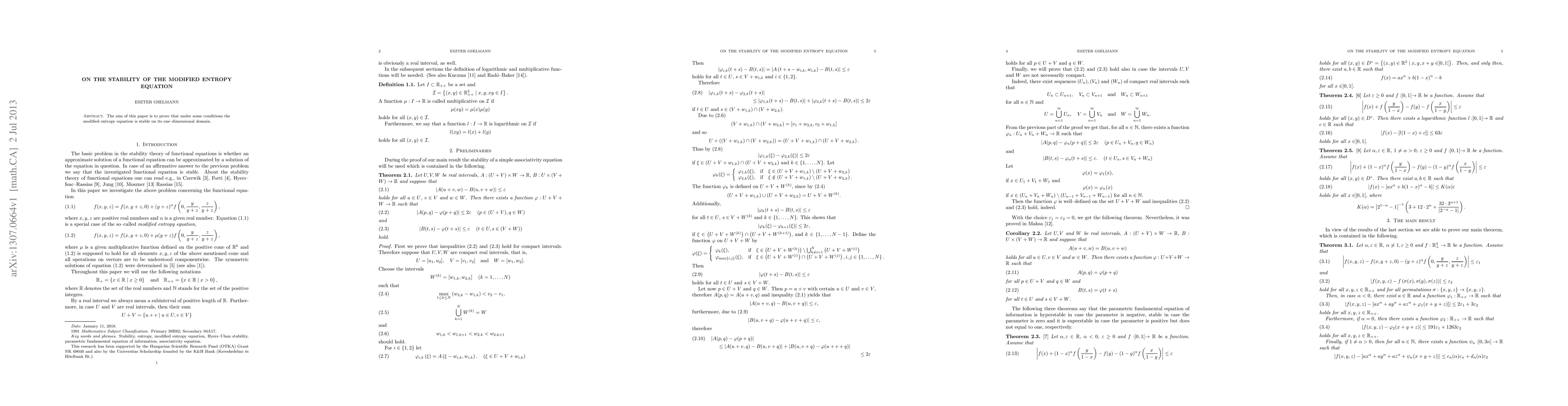 The aim of this paper is to prove that under some conditions the modified entropy equation is stable on its one-dimensional domain.