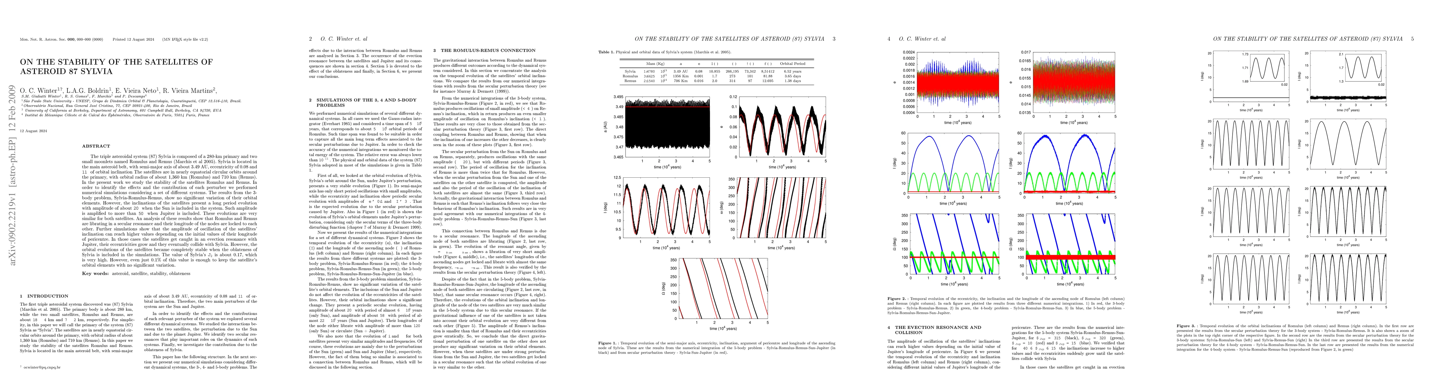 he triple asteroidal system (87) Sylvia is composed of a 280-km primary and two small moonlets named Romulus and Remus (Marchis et al 2005). Sylvia is located in the main asteroid belt. The satellites are in nearly equatorial circular orbits around the primary. In the present work we study the stability of the satellites Romulus and Remus, in order to identify the effects and the contribution of each perturber. The results from the 3-body problem, Sylvia-Romulus-Remus, show no significant variation of their orbital elements. However, the inclinations of the satellites present a long period evolution, when the Sun is included in the system. Such amplitude is amplified when Jupiter is included. An analysis of these results show that Romulus and Remus are librating in a secular resonance and their longitude of the nodes are locked to each other. The satellites get caught in an evection resonance with Jupiter. However, the orbital evolutions of the satellites became completely stable when the oblateness of Sylvia is included in the simulations.