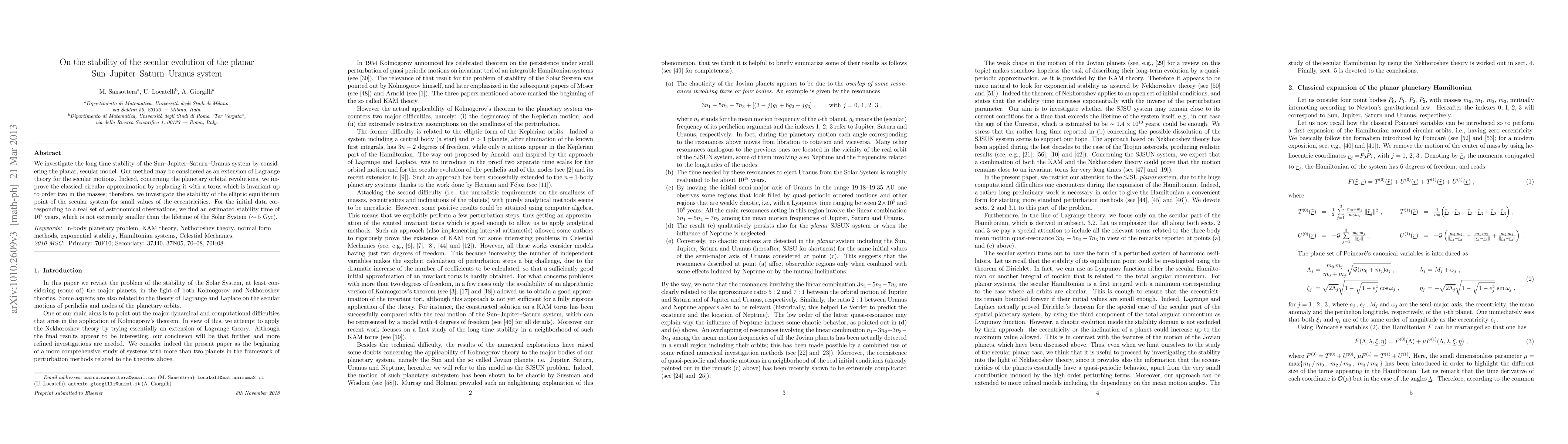 This paper examines the long-term stability of the Sun-Jupiter-Saturn-Uranus planar secular system, extending Lagrange's theory by using a torus approximation instead of the classical circular orbits. The study estimates a stability time of $10^7$ years for the system, indicating it remains relatively stable over the Solar System's lifetime.
