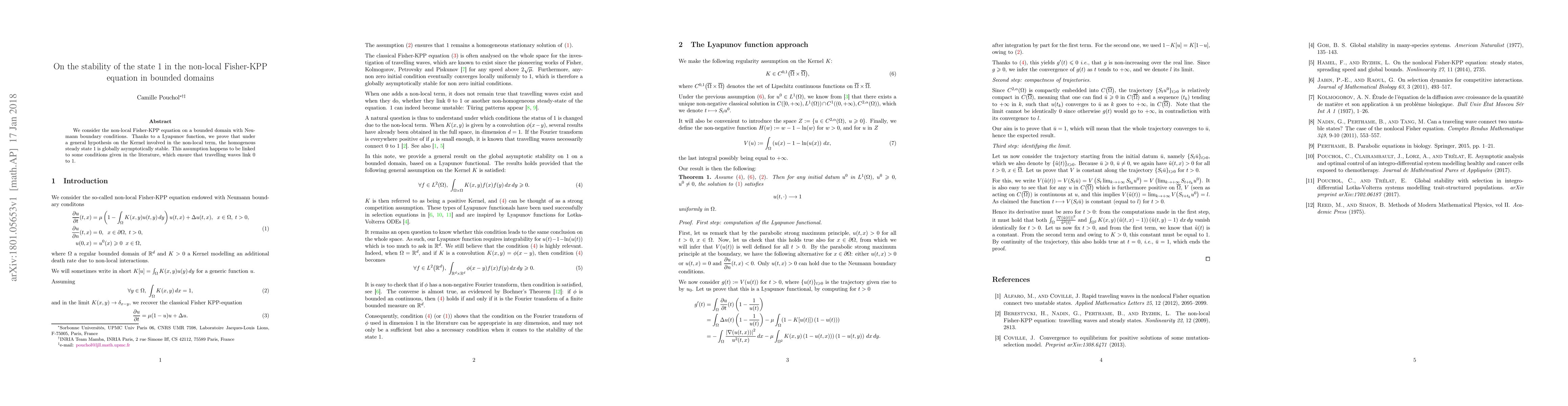 We consider the non-local Fisher-KPP equation on a bounded domain with Neu-mann boundary conditions. Thanks to a Lyapunov function, we prove that under a general hypothesis on the Kernel involved in the non-local term, the homogenous steady state 1 is globally asymptotically stable. This assumption happens to be linked to some conditions given in the literature, which ensure that travelling waves link 0 to 1.