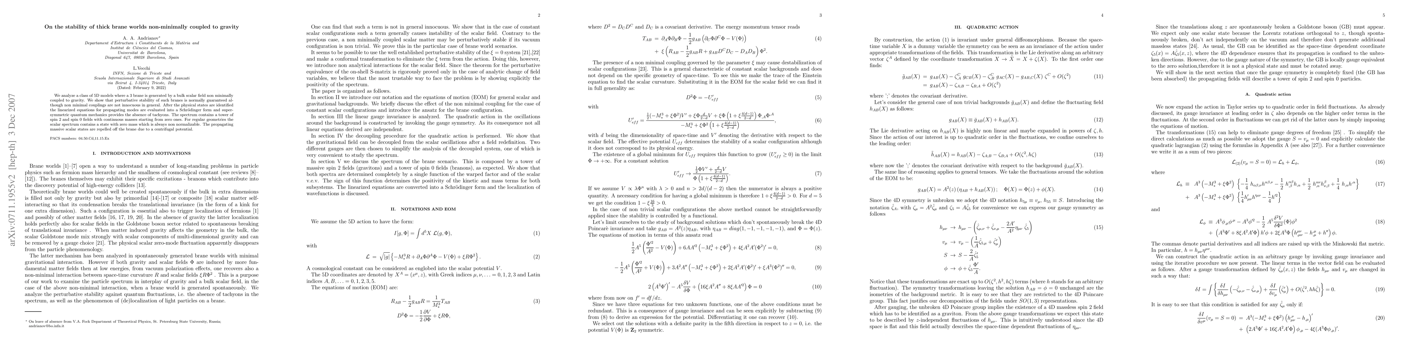 We analyze a class of 5D models where a 3 brane is generated by a bulk scalar field non minimally coupled to gravity. We show that perturbative stability of such branes is normally guaranteed although non minimal couplings are not innocuous in general. After the physical states are identified the linearized equations for propagating modes are evaluated into a Schroedinger form and supersymmetric quantum mechanics provides the absence of tachyons. The spectrum contains a tower of spin 2 and spin 0 fields with continuous masses starting from zero ones. For regular geometries the scalar spectrum contains a state with zero mass which is always non normalizable. The propagating massive scalar states are repelled off the brane due to a centrifugal potential.