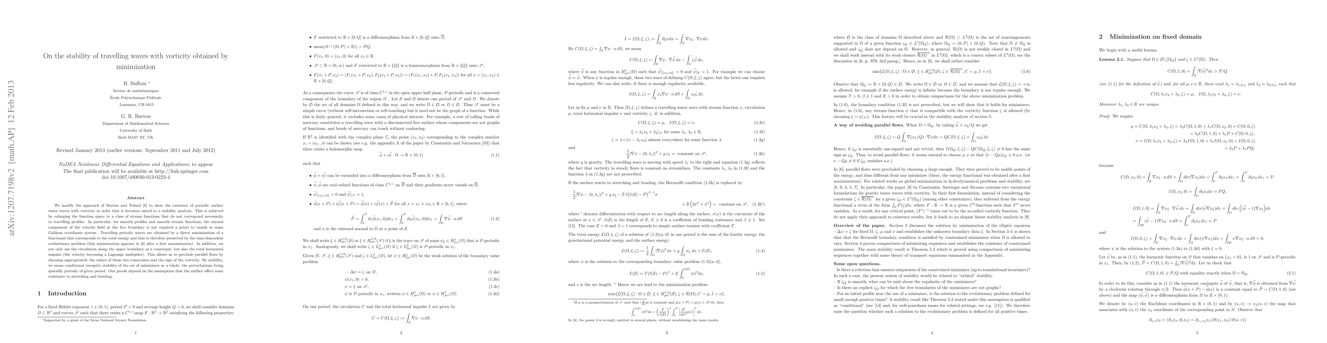 This paper shows that periodic surface water waves with vorticity exist and can be analyzed for stability using a modified minimization approach. It introduces new constraints to prevent parallel flows and allows for conditional energetic stability of the set of minimizers.