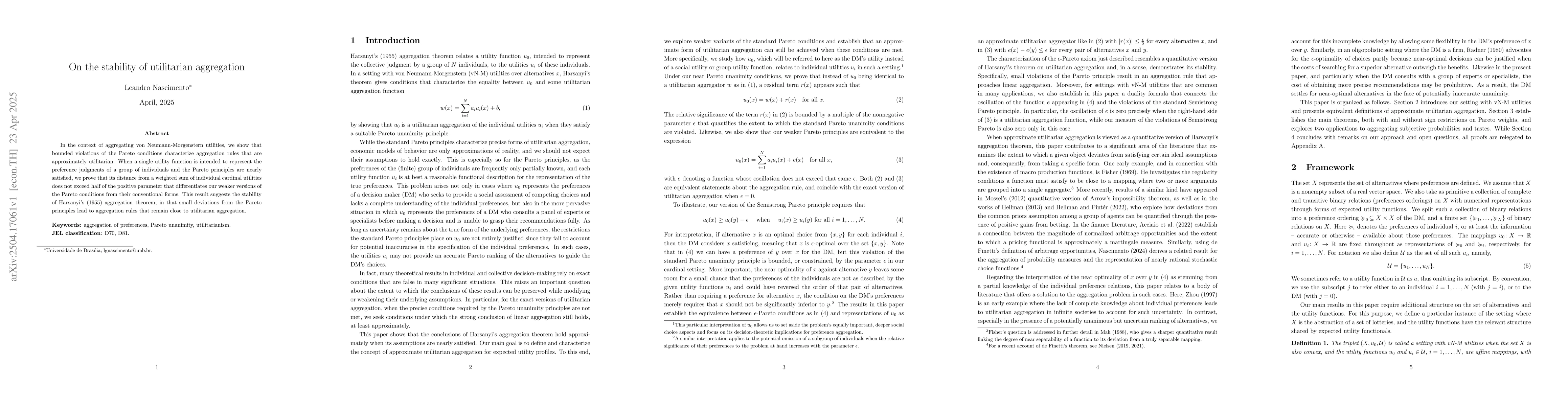 This work extends previous research by showing the approximate stability of utilitarian aggregation under weaker Pareto conditions, providing new insights into Harsanyi's aggregation theorem.