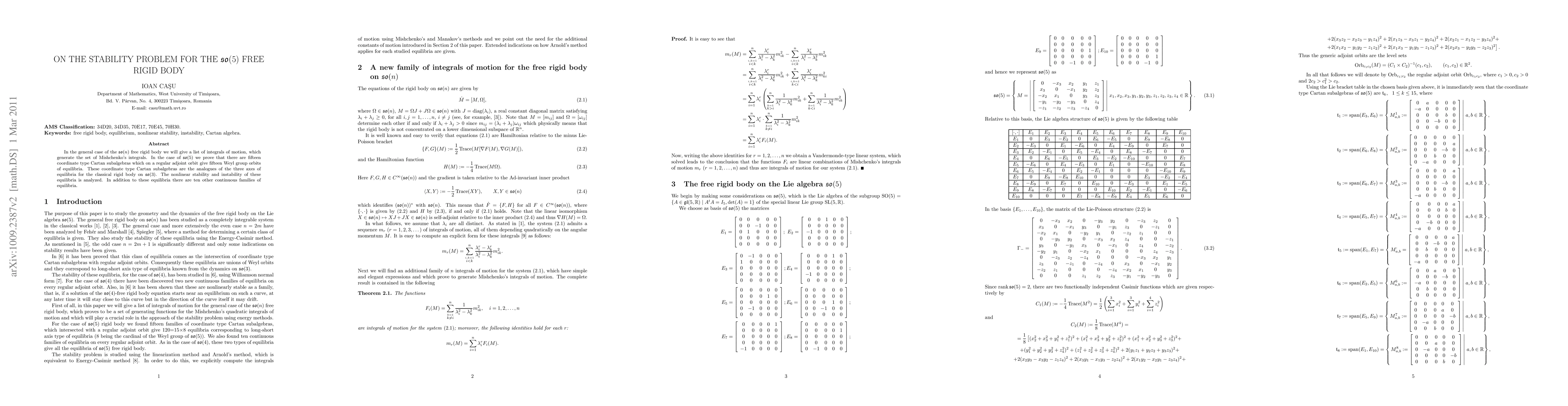 In the general case of the $\mathfrak{so}(n)$ free rigid body we give a list of integrals of motion, which generate the set of Mishchenko's integrals. In the case of $\mathfrak{so}(5)$ we prove that there are fifteen coordinate type Cartan subalgebras which on a regular adjoint orbit give fifteen Weyl group orbits of equilibria. These coordinate type Cartan subalgebras are the analogues of the three axes of equilibria for the classical rigid body on $\mathfrak{so}(3)$. The nonlinear stability and instability of these equilibria is analyzed. In addition to these equilibria there are ten other continuous families of equilibria.