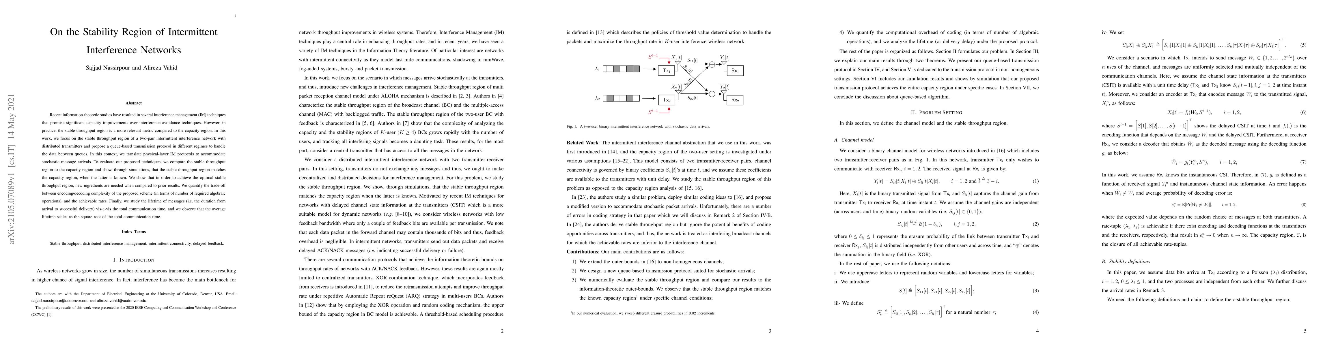 Recent information-theoretic studies have resulted in several interference management (IM) techniques that promise significant capacity improvements over interference avoidance techniques. However, in practice, the stable throughput region is a more relevant metric compared to the capacity region. In this work, we focus on the stable throughput region of a two-pair intermittent interference network with distributed transmitters and propose a queue-based transmission protocol in different regimes to handle the data between queues. In this context, we translate physical-layer IM protocols to accommodate stochastic message arrivals. To evaluate our proposed techniques, we compare the stable throughput region to the capacity region and show, through simulations, that the stable throughput region matches the capacity region when the latter is known. We show that in order to achieve the optimal stable throughput region, new ingredients are needed when compared to prior results. We quantify the trade-off between the encoding/decoding complexity of the proposed scheme (in terms of number of required algebraic operations), and the achievable rates. Finally, we study the lifetime of messages (i.e. the duration from arrival to successful delivery) vis-a-vis the total communication time, and we observe that the average lifetime scales as the square root of the total communication time.