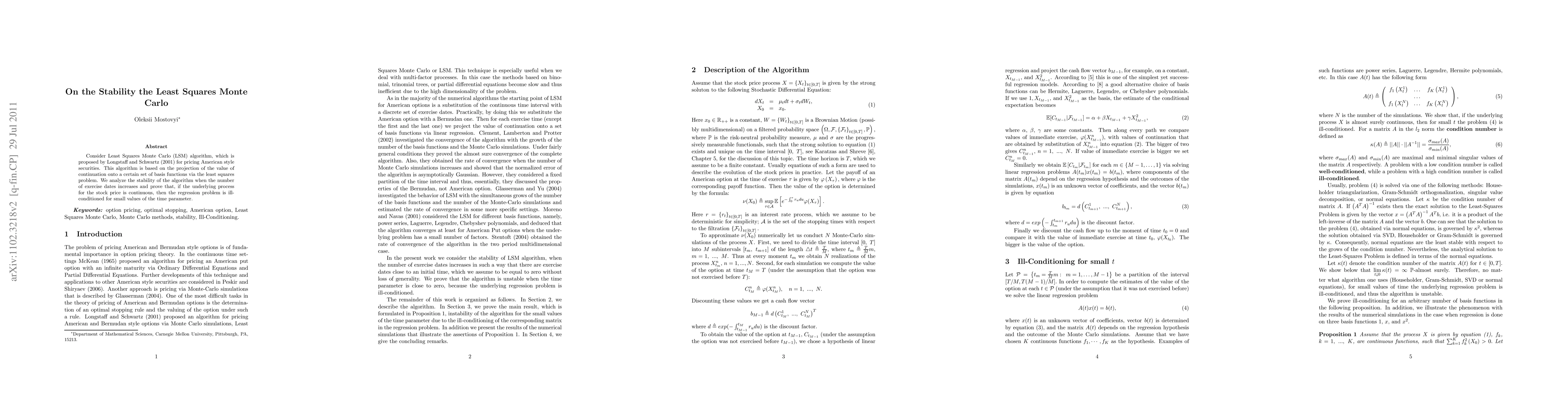 Summary: This paper analyzes the stability of the Least Squares Monte Carlo (LSM) algorithm for pricing American style securities, demonstrating that the regression problem becomes ill-conditioned as the number of exercise dates increases, especially when the underlying stock price process is continuous.