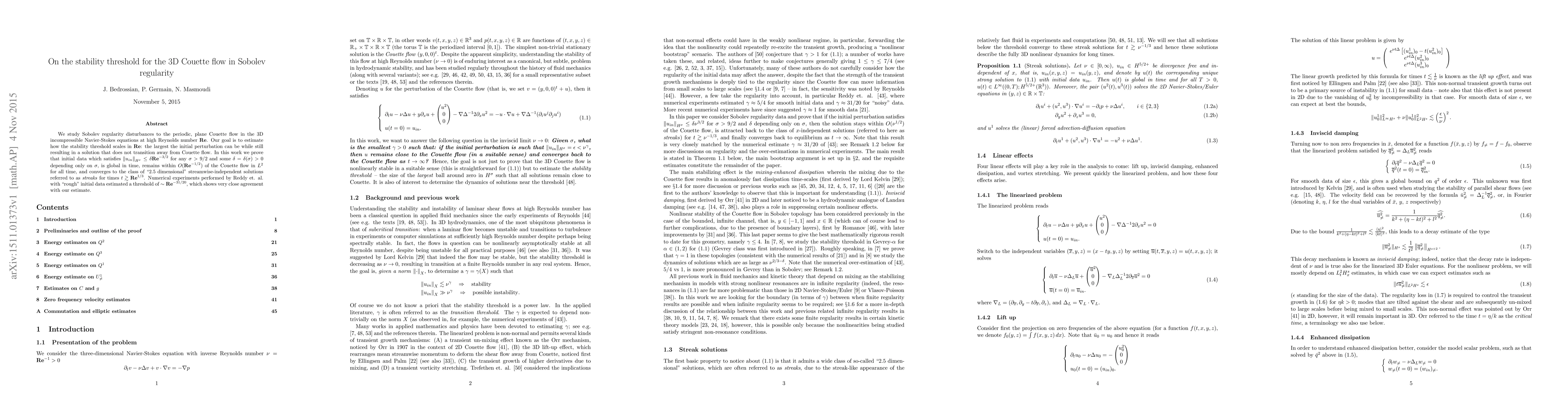 We study Sobolev regularity disturbances to the periodic, plane Couette flow in the 3D incompressible Navier-Stokes equations at high Reynolds number $\textbf{Re}$. Our goal is to estimate how the stability threshold scales in $\textbf{Re}$: the largest the initial perturbation can be while still resulting in a solution that does not transition away from Couette flow. In this work we prove that initial data which satisfies $\| u_{in} \|_{H^\sigma} \leq \delta\textbf{Re}^{-3/2}$ for any $\sigma > 9/2$ and some $\delta = \delta(\sigma) > 0$ depending only on $\sigma$, is global in time, remains within $O(\textbf{Re}^{-1/2})$ of the Couette flow in $L^2$ for all time, and converges to the class of "2.5 dimensional" streamwise-independent solutions referred to as streaks for times $t \gtrsim \textbf{Re}^{1/3}$. Numerical experiments performed by Reddy et. al. with "rough" initial data estimated a threshold of $\sim \textbf{Re}^{-31/20}$, which shows very close agreement with our estimate.