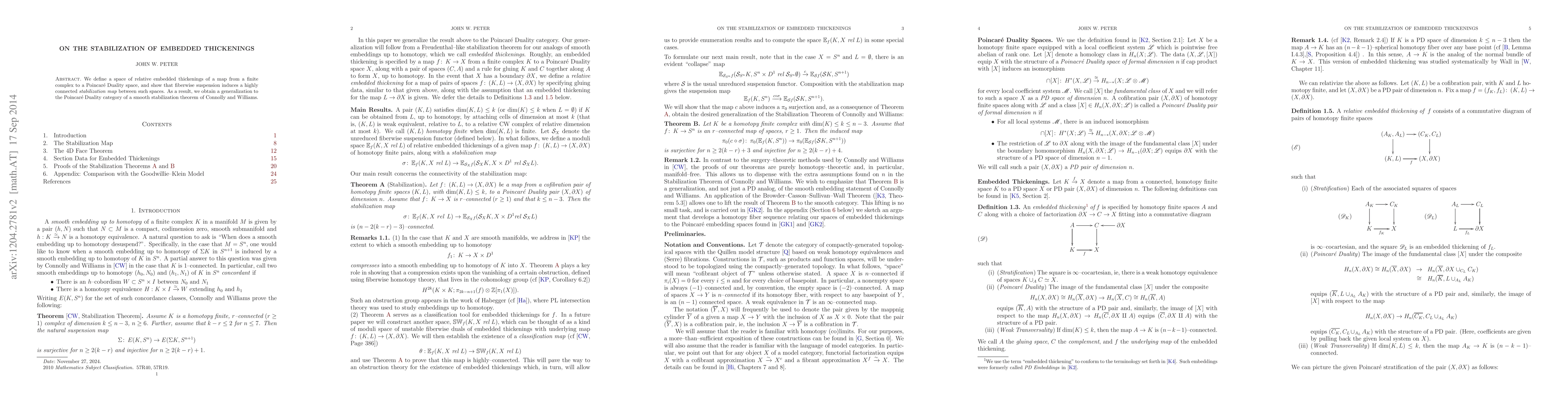 We define a space of relative embedded thickenings of a given map from a finite complex to a Poincare Duality space, and show that there is a highly connected stabilization map between such spaces induced by fiberwise suspension. As a result, we obtain a generalization to the Poincare Duality category of a smooth stabilization theorem of Connolly and Williams.
