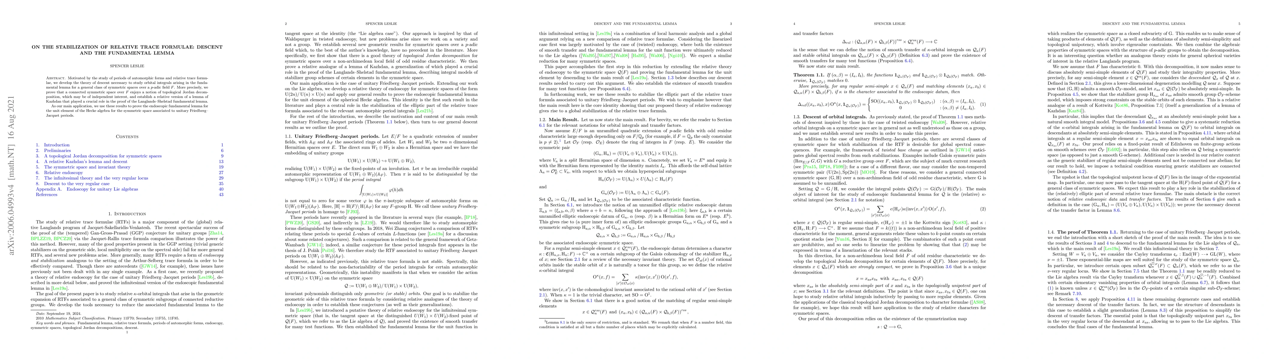 Motivated by the study of periods of automorphic forms and relative trace formulae, we develop the theory of descent necessary to study orbital integrals arising in the fundamental lemma for a general class of symmetric spaces over a $p$-adic field $F$. More precisely, we prove that a connected symmetric space over $F$ enjoys a notion of topological Jordan decomposition, which may be of independent interest, and establish a relative version of a lemma of Kazhdan that played a crucial role in the proof of the Langlands-Shelstad fundamental lemma. As our main application, we use these results to prove the endoscopic fundamental lemma for the unit element of the Hecke algebra for the symmetric space associated to unitary Friedberg-Jacquet periods.
