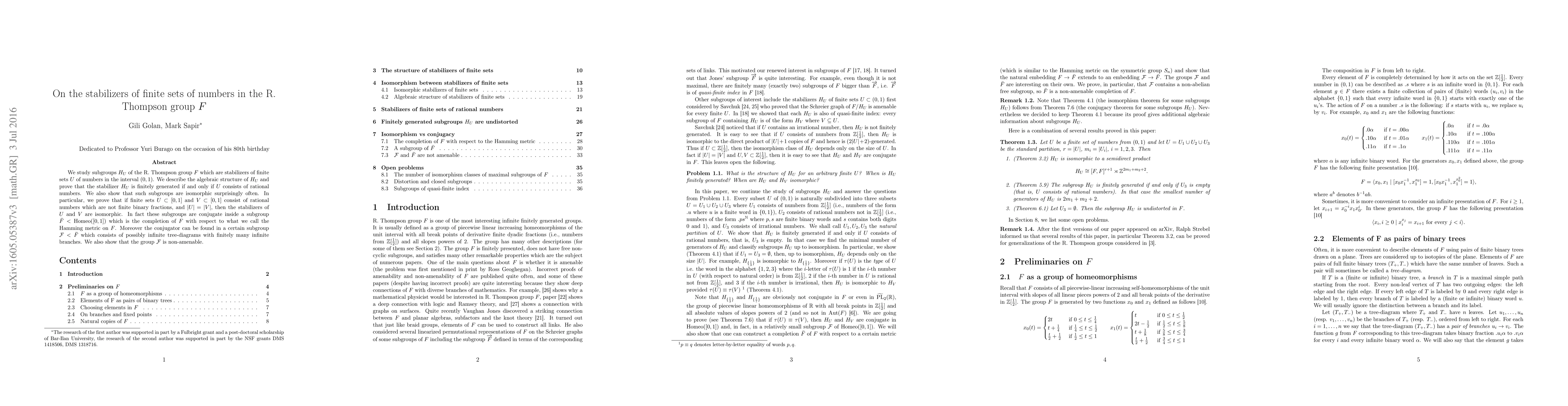 We study subgroups $H_U$ of the R. Thompson group $F$ which are stabilizers of finite sets $U$ of numbers in the interval $(0,1)$. We describe the algebraic structure of $H_U$ and prove that the stabilizer $H_U$ is finitely generated if and only if $U$ consists of rational numbers. We also show that such subgroups are isomorphic surprisingly often. In particular, we prove that if finite sets $U\subset [0,1]$ and $V\subset [0,1]$ consist of rational numbers which are not finite binary fractions, and $|U|=|V|$, then the stabilizers of $U$ and $V$ are isomorphic. In fact these subgroups are conjugate inside a subgroup $\bar F<\Homeo([0,1])$ which is the completion of $F$ with respect to what we call the Hamming metric on $F$. Moreover the conjugator can be found in a certain subgroup $\F < \bar F$ which consists of possibly infinite tree-diagrams with finitely many infinite branches. We also show that the group $\F$ is non-amenable.