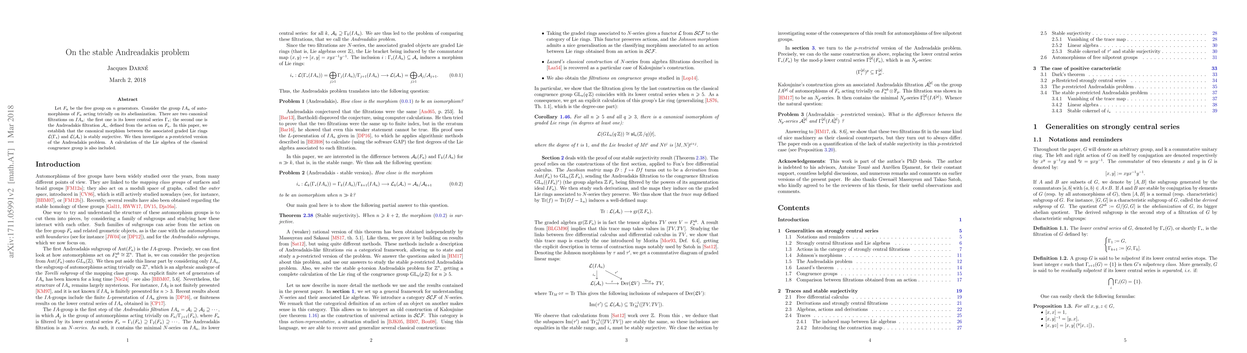 Let $F\_n$ be the free group on $n$ generators. Consider the group $IA\_n$ of automorpisms of $F\_n$ acting trivially on its abelianization. There are two canonical filtrations on $IA\_n$: the first one is its lower central series $\Gamma\_*$; the second one is the Andreadakis filtration $\mathcal A\_*$, defined from the action on $F\_n$. In this paper, we establish that the canonical morphism between the associated graded Lie rings ${\mathcal L}(\Gamma\_*)$ and ${\mathcal L}(\mathcal A\_*)$ is stably surjective. We then investigate a $p$-restricted version of the Andreadakis problem. A calculation of the Lie algebra of the classical congruence group is also included.