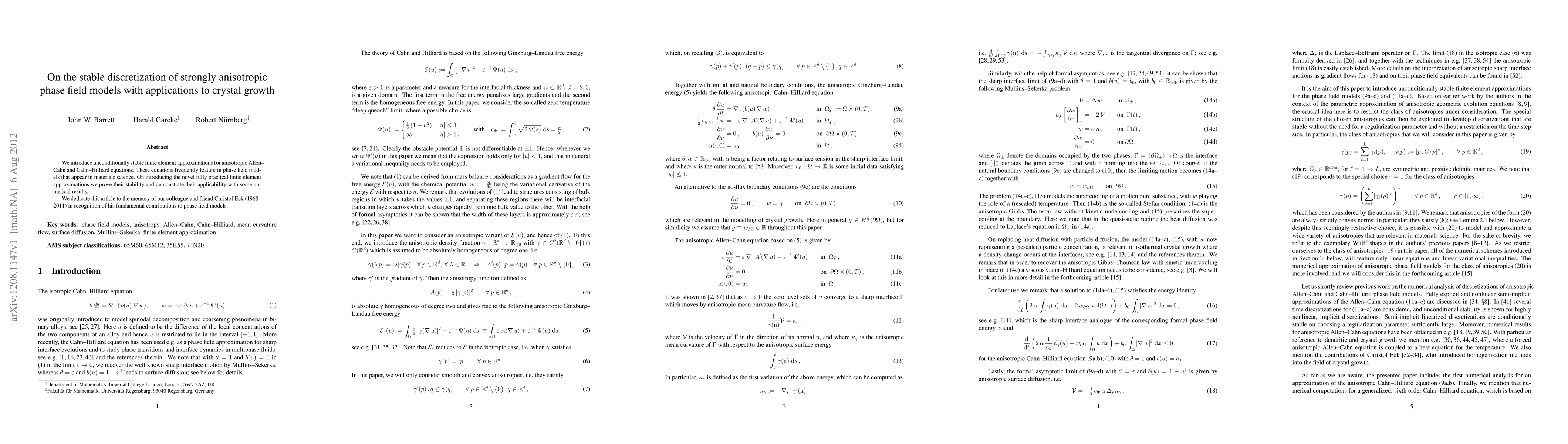 This paper presents unconditionally stable finite element methods for anisotropic Allen-Cahn and Cahn-Hilliard equations, crucial in phase field models for materials science. The authors prove stability and validate the methods with numerical results, dedicating the work to the memory of Christof Eck for his foundational contributions.