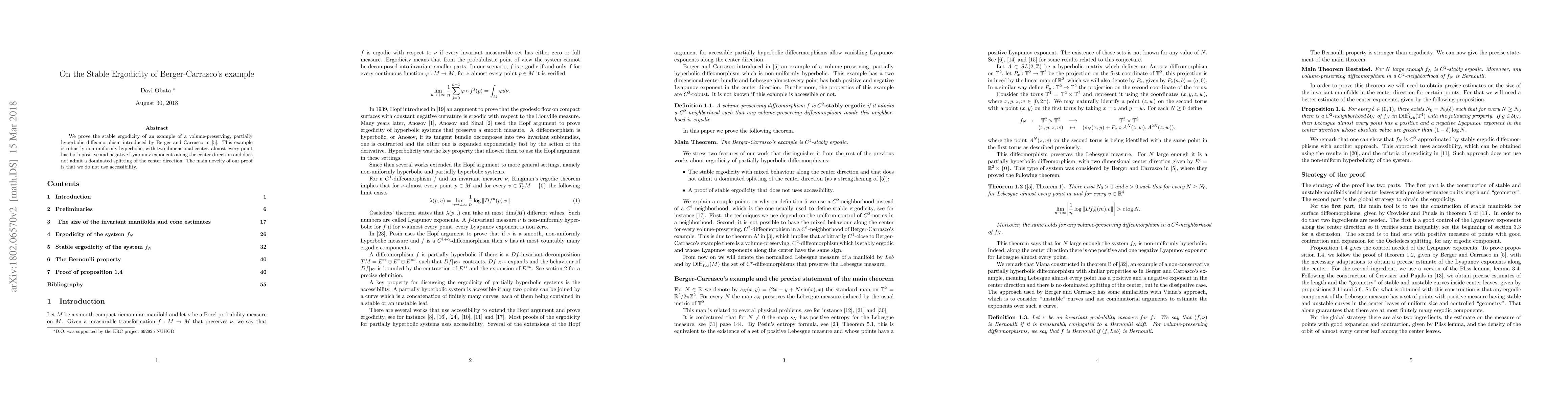 Summary: This paper proves the stable ergodicity of a volume-preserving, partially hyperbolic diffeomorphism by Berger and Carrasco, demonstrating its robust non-uniform hyperbolicity and the absence of dominated splitting, without relying on accessibility.