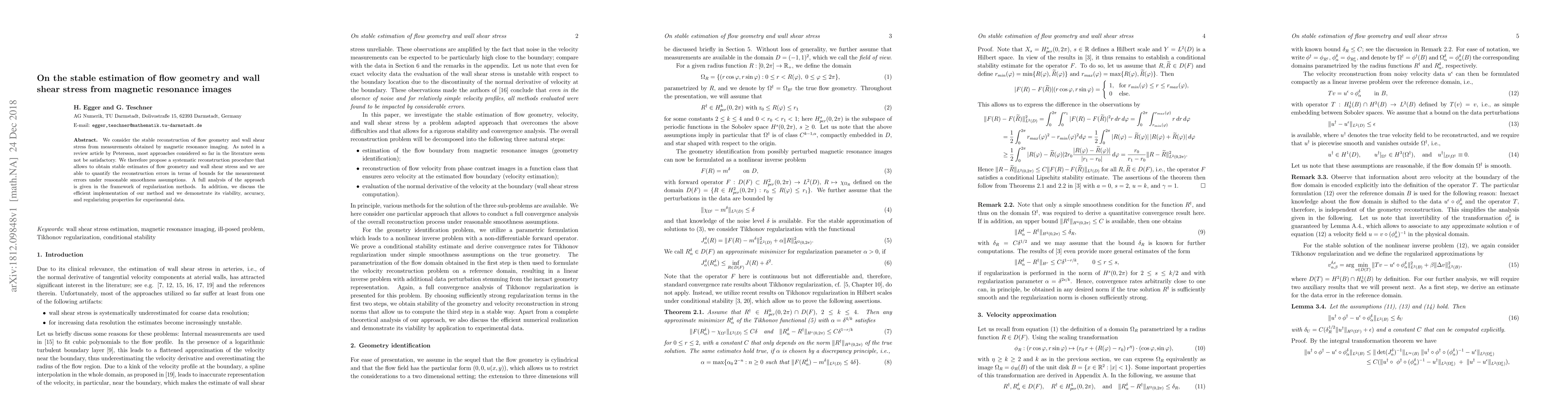 We consider the stable reconstruction of flow geometry and wall shear stress from measurements obtained by magnetic resonance imaging. As noted in a review article by Petersson, most approaches considered so far in the literature seem not be satisfactory. We therefore propose a systematic reconstruction procedure that allows to obtain stable estimates of flow geometry and wall shear stress and we are able to quantify the reconstruction errors in terms of bounds for the measurement errors under reasonable smoothness assumptions. A full analysis of the approach is given in the framework of regularization methods. In addition, we discuss the efficient implementation of our method and we demonstrate its viability, accuracy, and regularizing properties for experimental data.