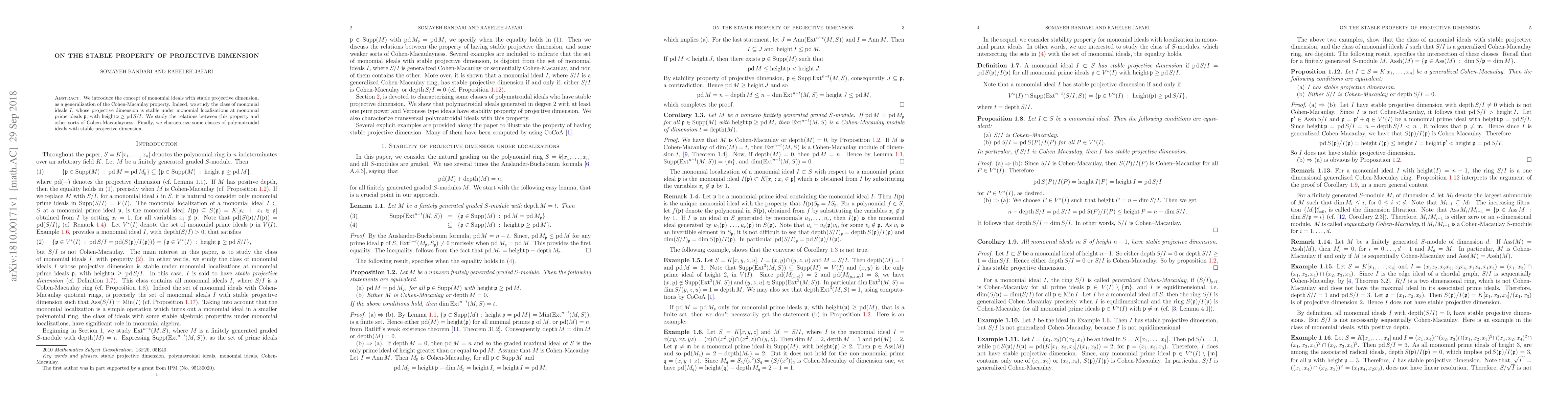 We introduce the concept of monomial ideals with stable projective dimension, as a generalization of the Cohen-Macaulay property. Indeed, we study the class of monomial ideals $I$, whose projective dimension is stable under monomial localizations at monomial prime ideals $\fp$, with $\height \fp\geq \pd S/I$. We study the relations between this property and other sorts of Cohen-Macaulayness. Finally, we characterize some classes of polymatroidal ideals with stable projective dimension.
