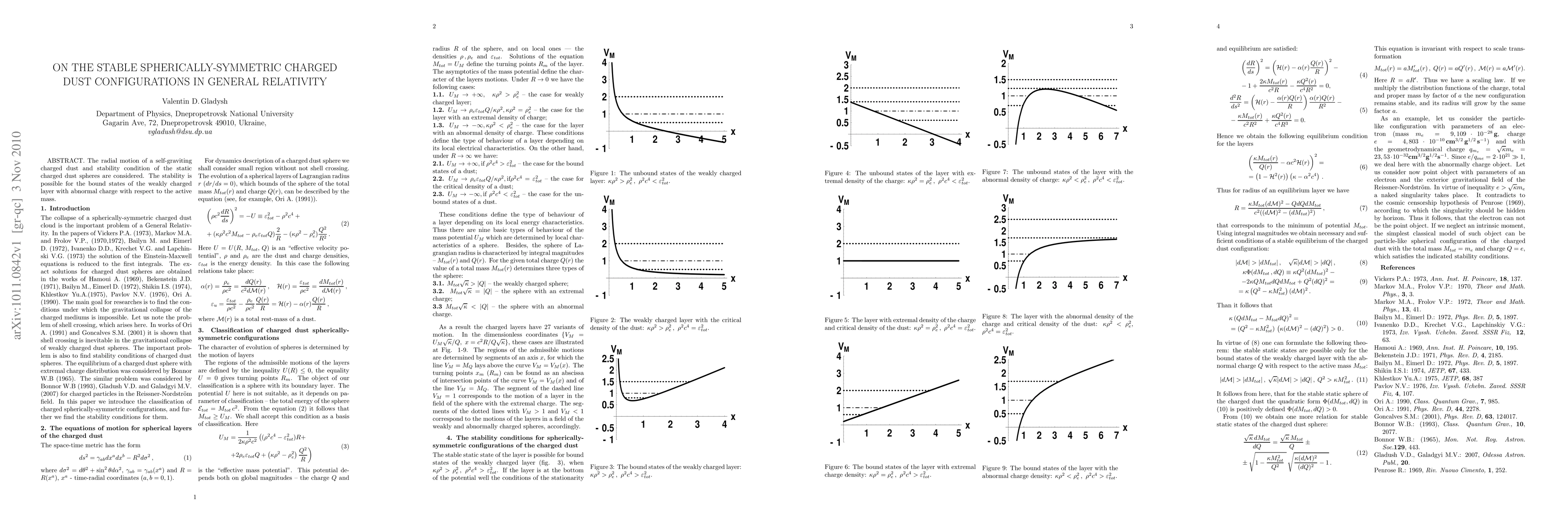 Summary: This paper investigates the radial motion and stability conditions of static, spherically-symmetric charged dust spheres in general relativity, finding that stability is achievable for weakly charged layers with abnormal charge relative to the active mass.