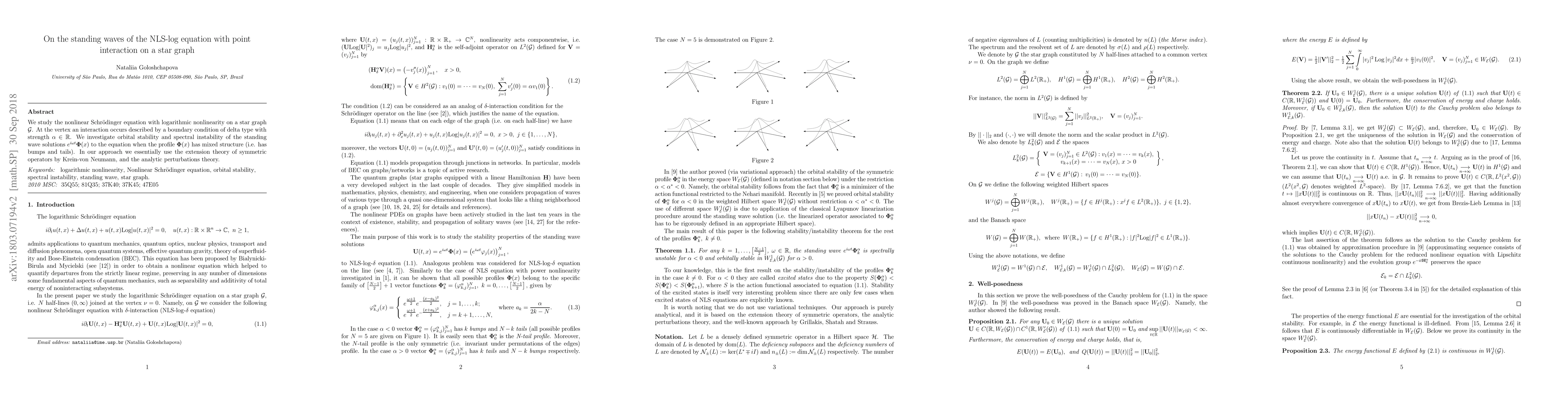 We study a nonlinear Schr\"odinger equation with logarithmic nonlinearity on a star graph $\mathcal{G}$. At the vertex an interaction occurs described by a boundary condition of delta type with strength $\alpha\in \mathbb{R}$. We investigate orbital stability and spectral instability of the standing wave solutions $e^{i\omega t}\mathbf{\Phi}(x)$ to the equation when the profile $\mathbf\Phi(x)$ has mixed structure (i.e. has bumps and tails). In our approach we essentially use the extension theory of symmetric operators by Krein - von Neumann, and the analytic perturbations theory.