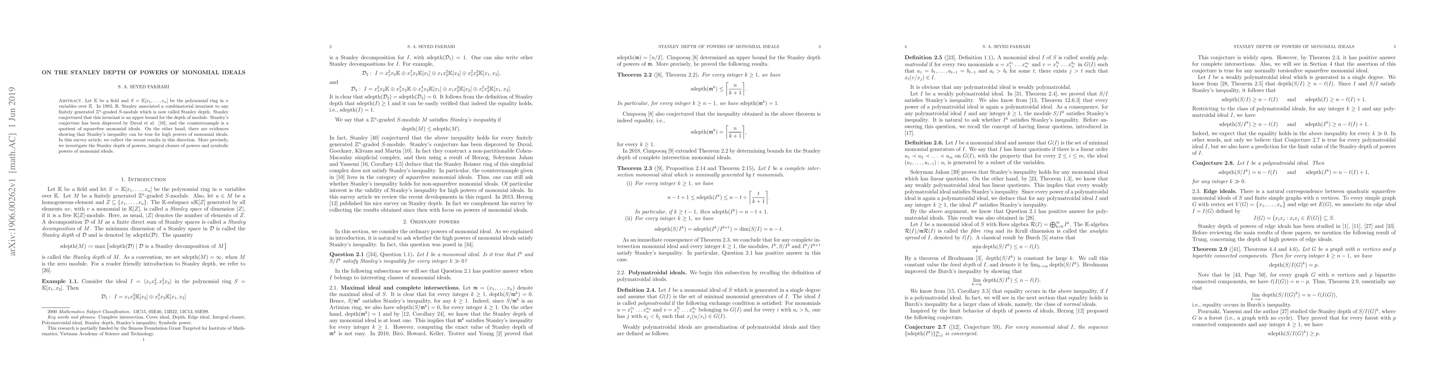 Let $\mathbb{K}$ be a field and $S=\mathbb{K}[x_1,\dots,x_n]$ be the polynomial ring in $n$ variables over $\mathbb{K}$. In 1982, R. Stanley associated a combinatorial invariant to any finitely generated $\mathbb{Z}^n$-graded $S$-module which is now called Stanley depth. Stanley conjectured that this invariant is an upper bound for the depth of module. Stanley's conjecture has been disproved by Duval et al. \cite{abcj}, and the counterexample is a quotient of squarefree monomial ideals. On the other hand, there are evidences showing that Stanley's inequality can be true for high powers of monomial ideals. In this survey article, we collect the recent results in this direction. More precisely, we investigate the Stanley depth of powers, integral closure of powers and symbolic powers of monomial ideals.