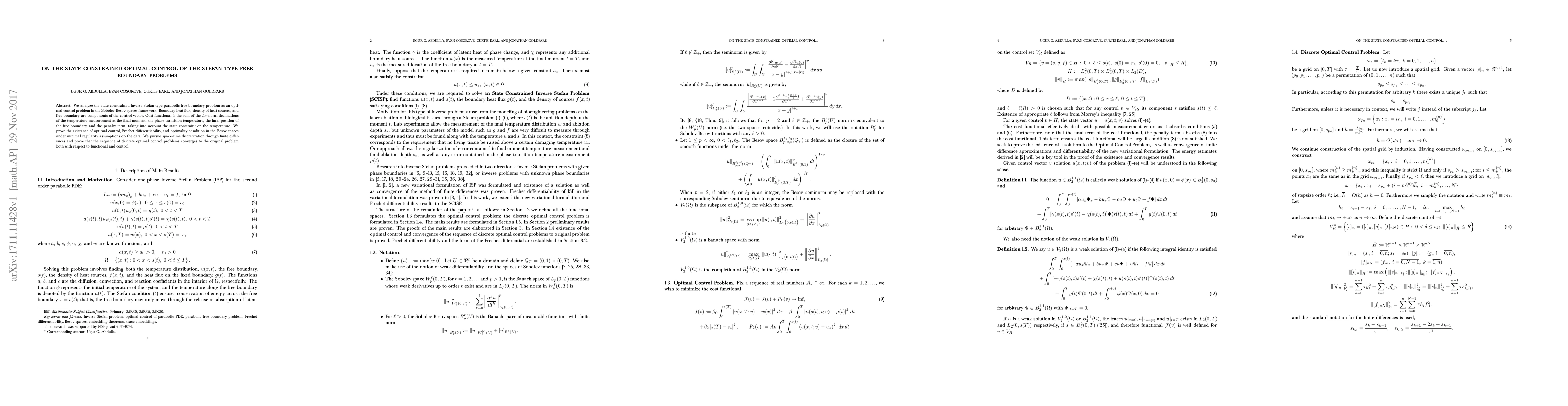 This paper investigates the optimal control of state-constrained Stefan type free boundary problems within the Sobolev-Besov spaces framework. It establishes the existence of optimal control, proves Frechet differentiability, and demonstrates convergence of discretized control problems to the original problem.