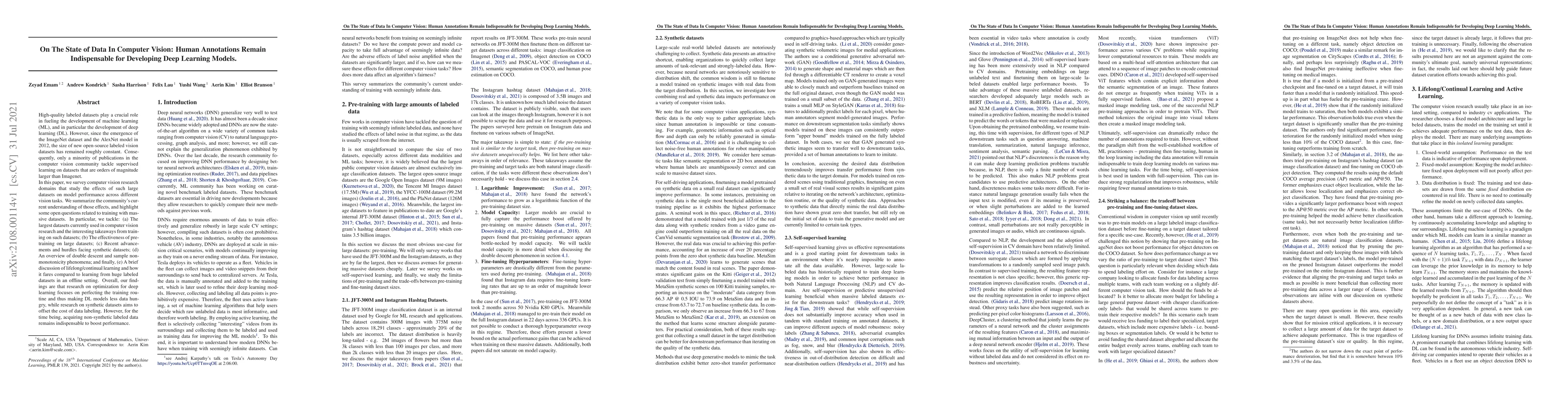 High-quality labeled datasets play a crucial role in fueling the development of machine learning (ML), and in particular the development of deep learning (DL). However, since the emergence of the ImageNet dataset and the AlexNet model in 2012, the size of new open-source labeled vision datasets has remained roughly constant. Consequently, only a minority of publications in the computer vision community tackle supervised learning on datasets that are orders of magnitude larger than Imagenet. In this paper, we survey computer vision research domains that study the effects of such large datasets on model performance across different vision tasks. We summarize the community's current understanding of those effects, and highlight some open questions related to training with massive datasets. In particular, we tackle: (a) The largest datasets currently used in computer vision research and the interesting takeaways from training on such datasets; (b) The effectiveness of pre-training on large datasets; (c) Recent advancements and hurdles facing synthetic datasets; (d) An overview of double descent and sample non-monotonicity phenomena; and finally, (e) A brief discussion of lifelong/continual learning and how it fares compared to learning from huge labeled datasets in an offline setting. Overall, our findings are that research on optimization for deep learning focuses on perfecting the training routine and thus making DL models less data hungry, while research on synthetic datasets aims to offset the cost of data labeling. However, for the time being, acquiring non-synthetic labeled data remains indispensable to boost performance.