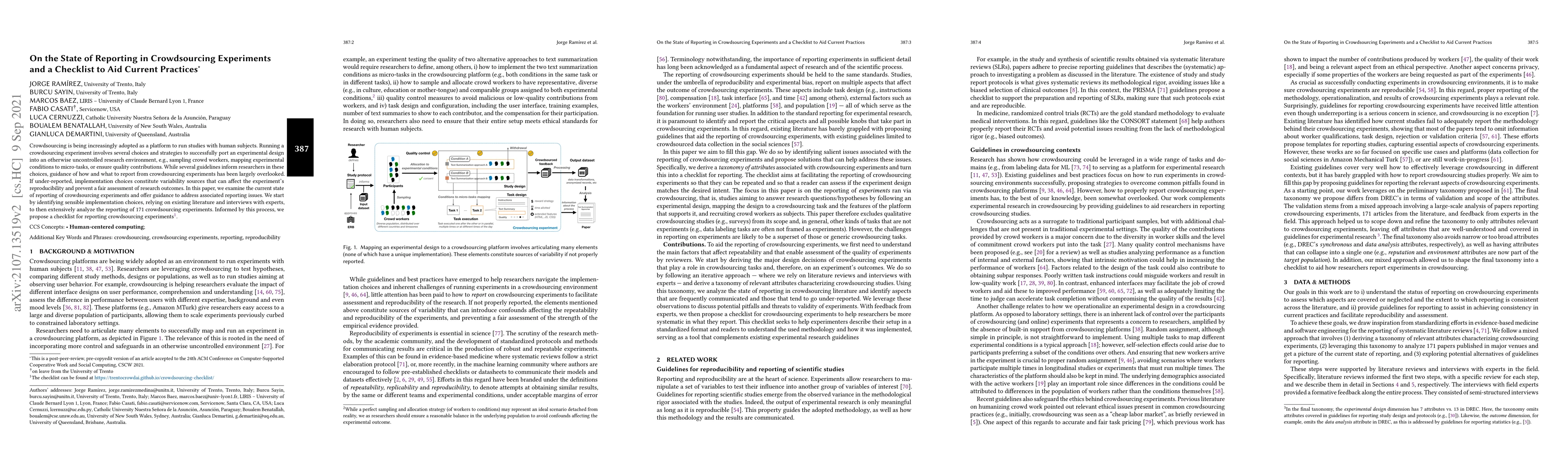 This paper investigates the current state of reporting in crowdsourcing experiments and proposes a checklist to improve transparency and reproducibility. It identifies key implementation choices and analyzes the reporting of 171 experiments to develop guidelines for better reporting practices.