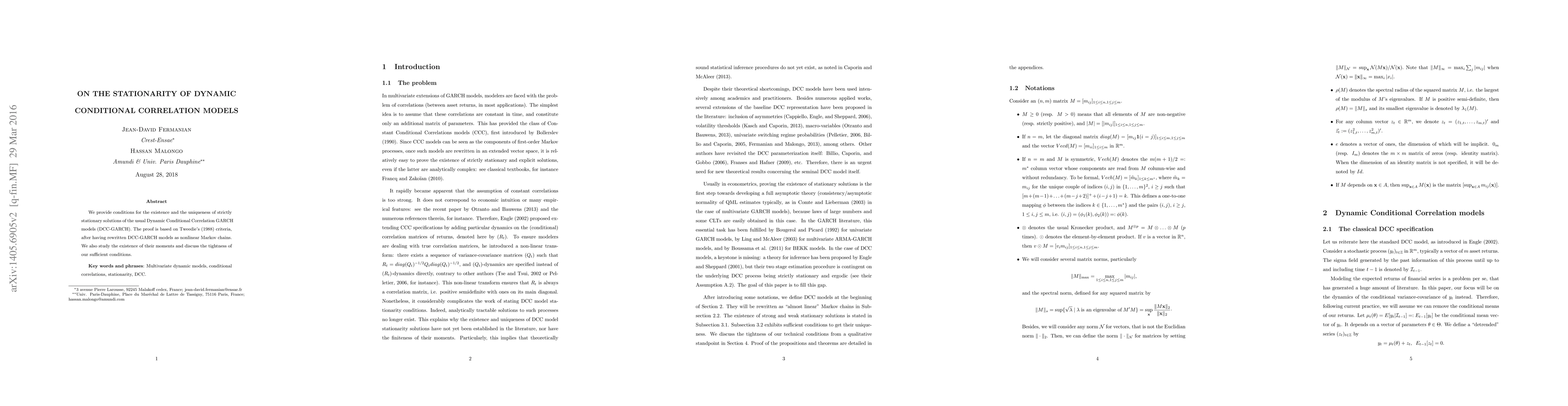 We provide conditions for the existence and the unicity of strictly stationary solutions of the usual Dynamic Conditional Correlation GARCH models (DCC-GARCH). The proof is based on Tweedie's (1988) criteria, after having rewritten DCC-GARCH models as nonlinear Markov chains. Moreover, we study the existence of their finite moments.