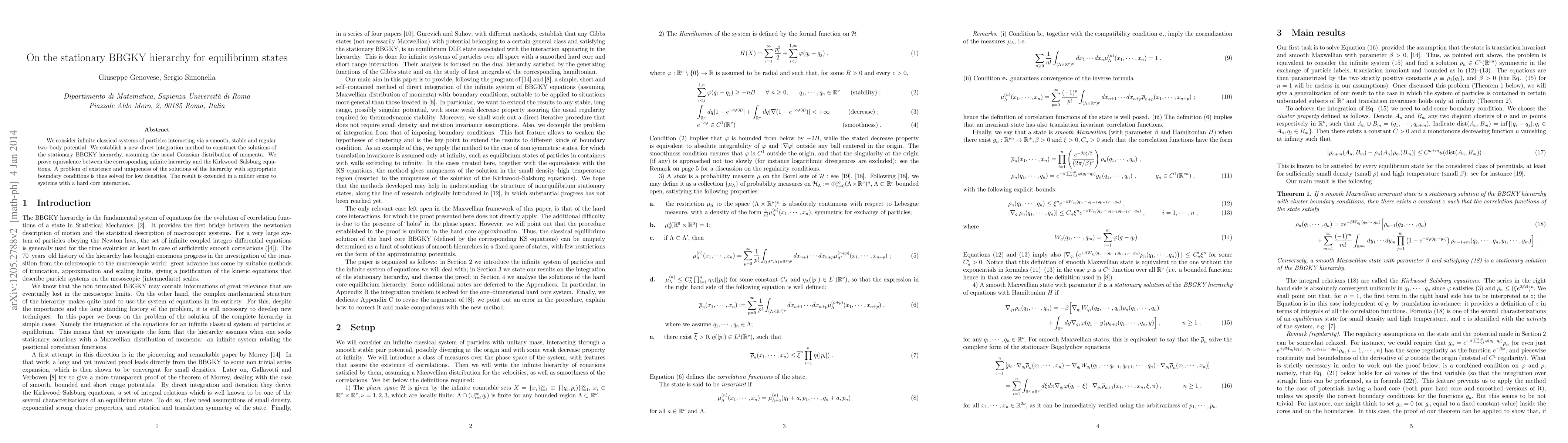 This paper introduces a novel direct integration method to solve the stationary BBGKY hierarchy for equilibrium states in infinite classical particle systems, proving its equivalence to the Kirkwood-Salsburg equations. It resolves the existence and uniqueness of solutions under low densities and extends the results to systems with hard core interactions, comparing its effectiveness with other integration techniques.