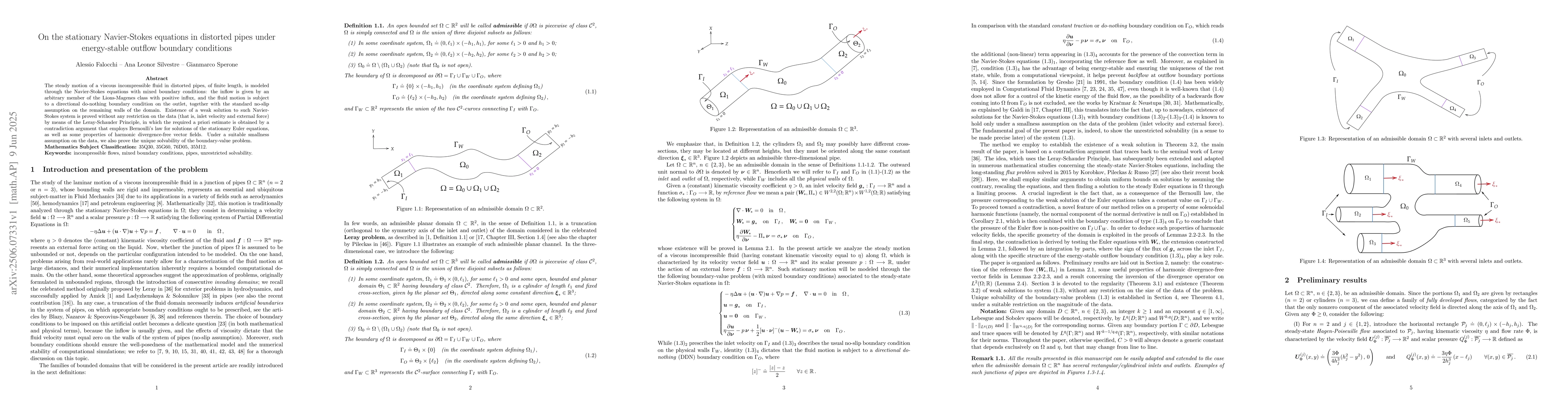 The steady motion of a viscous incompressible fluid in distorted pipes, of finite length, is modeled through the Navier-Stokes equations with mixed boundary conditions: the inflow is given by an arbitrary member of the Lions-Magenes class with positive influx, and the fluid motion is subject to a directional do-nothing boundary condition on the outlet, together with the standard no-slip assumption on the remaining walls of the domain. Existence of a weak solution to such Navier-Stokes system is proved without any restriction on the data (that is, inlet velocity and external force) by means of the Leray-Schauder Principle, in which the required a priori estimate is obtained by a contradiction argument that employs Bernoulli's law for solutions of the stationary Euler equations, as well as some properties of harmonic divergence-free vector fields. Under a suitable smallness assumption on the data, we also prove the unique solvability of the boundary-value problem.