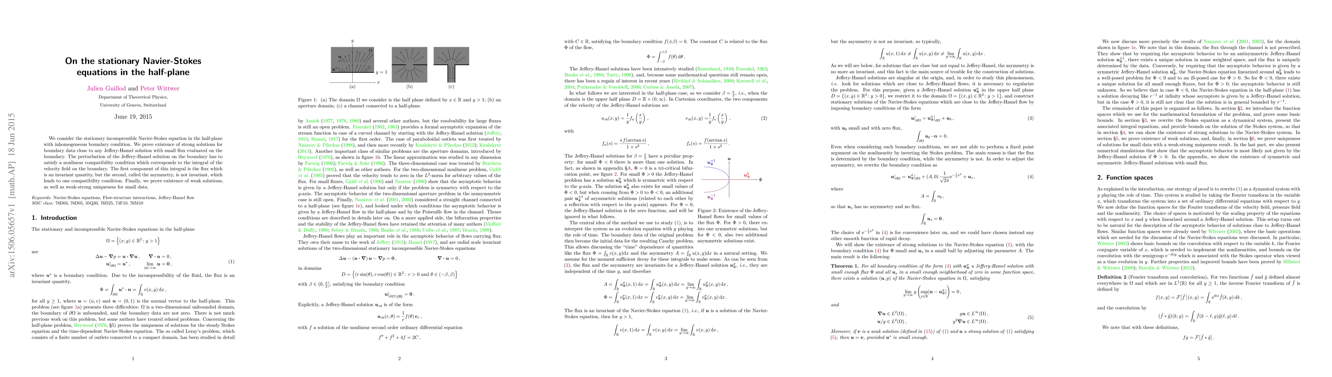 Researchers prove existence of strong solutions for stationary Navier-Stokes equations in a half-plane with boundary data close to Jeffery-Hamel solutions, and also show the existence of weak solutions and uniqueness for small data.