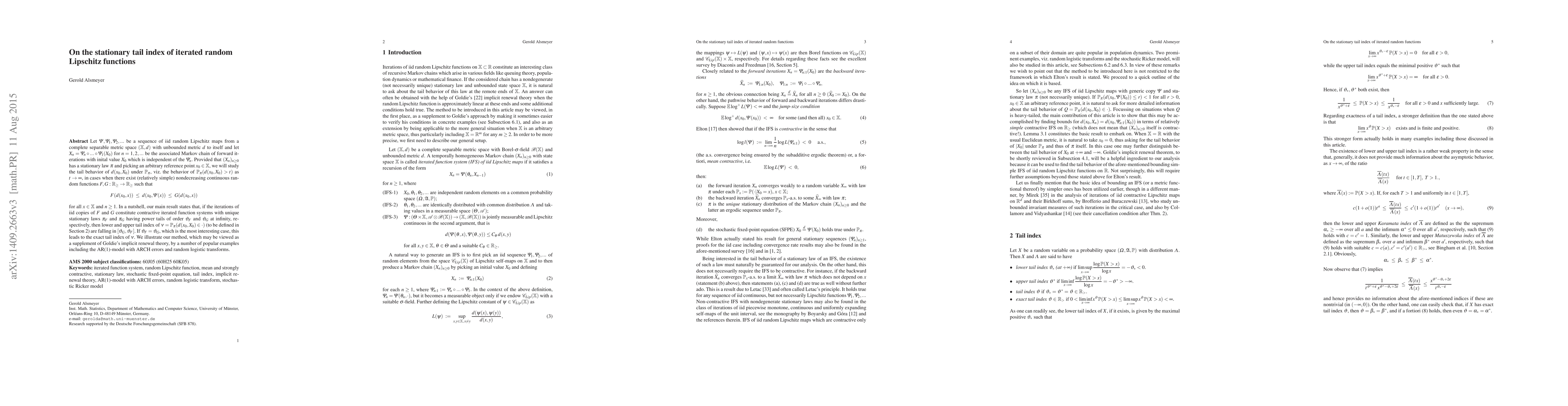 This paper explores the stationary tail behavior of iterated random Lipschitz functions, focusing on the functional distance from a reference point. It provides bounds for the lower and upper tail indices of these distances, illustrated through examples like AR(1) models and random logistic transforms.