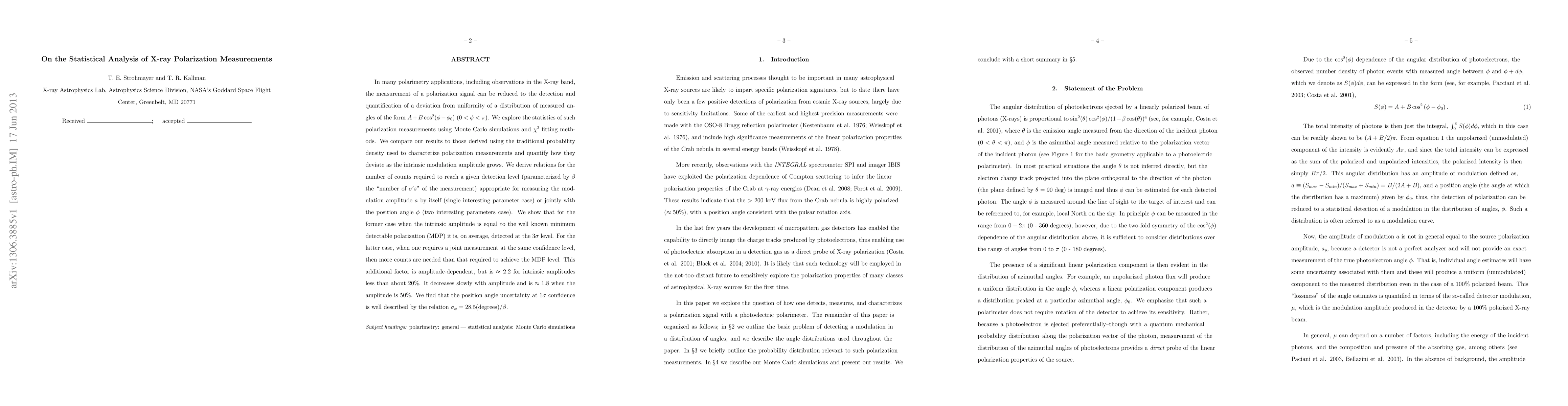 This paper investigates the statistical methods for analyzing X-ray polarization measurements, comparing Monte Carlo simulations and chi-squared fitting to traditional probability density methods. It finds that more counts are required for joint measurements of modulation amplitude and position angle compared to single parameter measurements, with an amplitude-dependent additional factor that averages around 2.2 for lower amplitudes.
