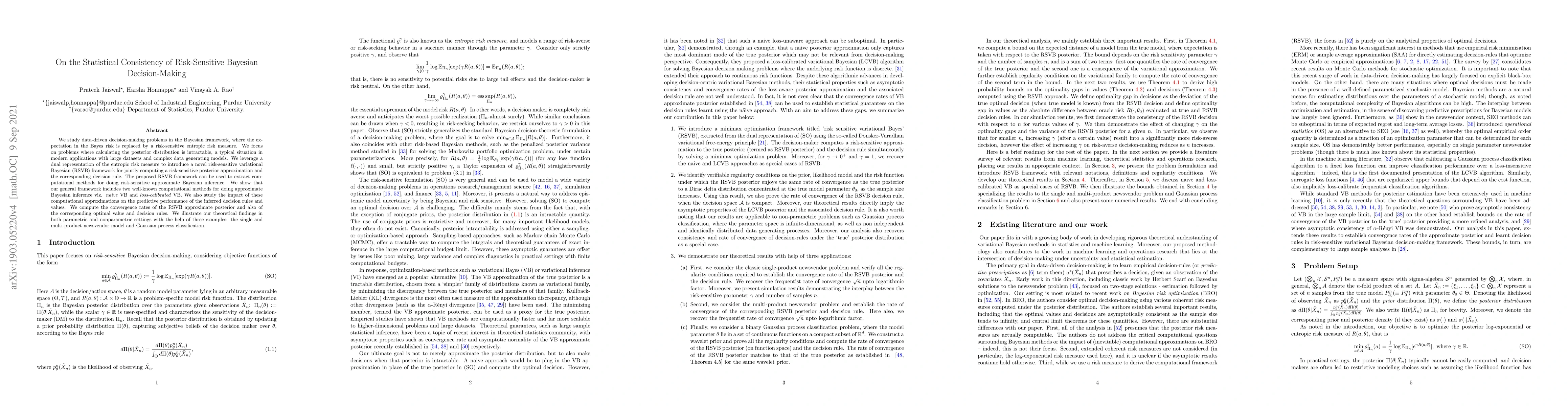 We study data-driven decision-making problems in the Bayesian framework, where the expectation in the Bayes risk is replaced by a risk-sensitive entropic risk measure. We focus on problems where calculating the posterior distribution is intractable, a typical situation in modern applications with large datasets and complex data generating models. We leverage a dual representation of the entropic risk measure to introduce a novel risk-sensitive variational Bayesian (RSVB) framework for jointly computing a risk-sensitive posterior approximation and the corresponding decision rule. The proposed RSVB framework can be used to extract computational methods for doing risk-sensitive approximate Bayesian inference. We show that our general framework includes two well-known computational methods for doing approximate Bayesian inference viz. naive VB and loss-calibrated VB. We also study the impact of these computational approximations on the predictive performance of the inferred decision rules and values. We compute the convergence rates of the RSVB approximate posterior and also of the corresponding optimal value and decision rules. We illustrate our theoretical findings in both parametric and nonparametric settings with the help of three examples: the single and multi-product newsvendor model and Gaussian process classification.