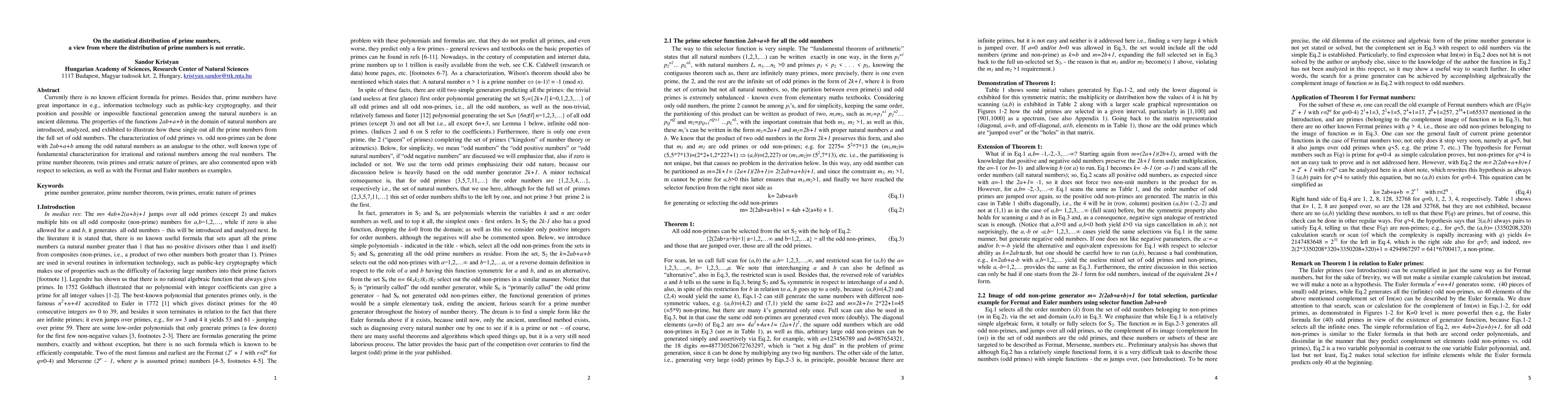 This paper explores the statistical distribution of prime numbers and introduces the function 2ab+a+b to characterize odd primes, demonstrating its ability to distinguish them from odd non-primes. It discusses the importance of primes in fields like cryptography and comments on the prime number theorem and the nature of twin primes, while also referencing Fermat and Euler numbers.