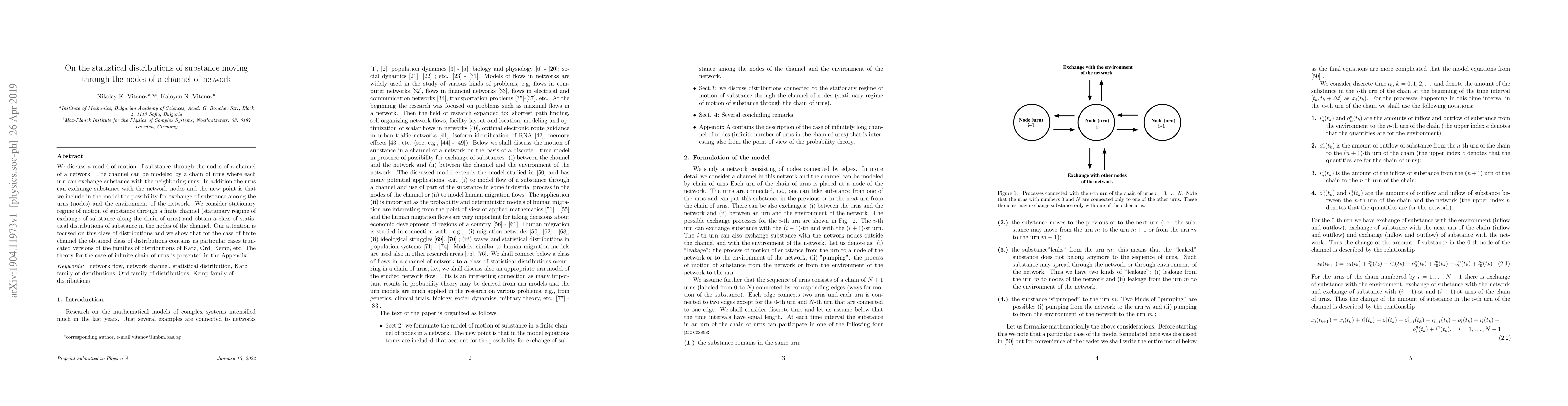 We discuss a model of motion of substance through the nodes of a channel of a network. The channel can be modeled by a chain of urns where each urn can exchange substance with the neighboring urns. In addition the urns can exchange substance with the network nodes and the new point is that we include in the model the possibility for exchange of substance among the urns (nodes) and the environment of the network. We consider stationary regime of motion of substance through a finite channel (stationary regime of exchange of substance along the chain of urns) and obtain a class of statistical distributions of substance in the nodes of the channel. Our attention is focused on this class of distributions and we show that for the case of finite channel the obtained class of distributions contains as particular cases truncated versions of the families of distributions of Katz, Ord, Kemp, etc. The theory for the case of infinite chain of urns is presented in the Appendix.