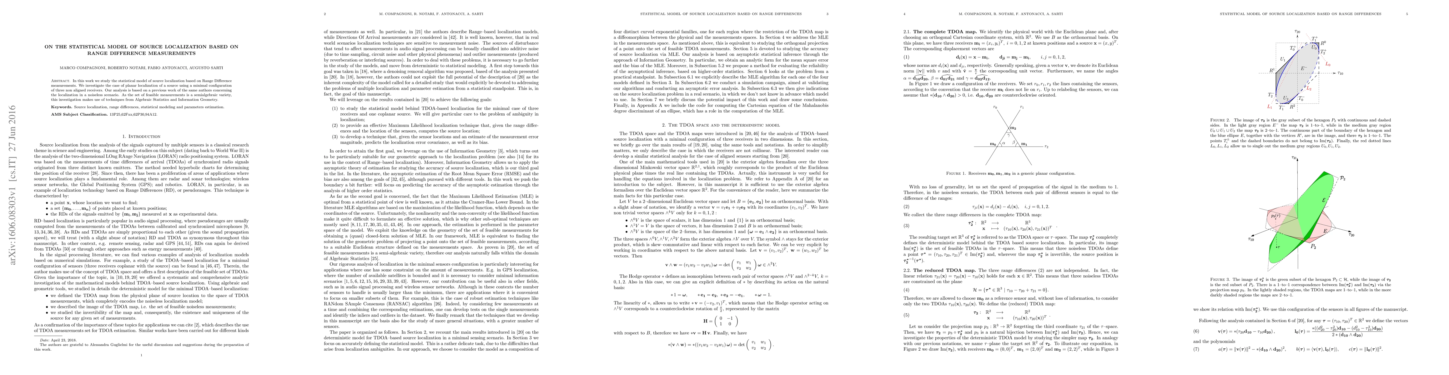 This paper explores the statistical model for source localization using range difference measurements, focusing on planar localization with three non-aligned receivers. It employs techniques from Algebraic Statistics and Information Geometry to analyze the semialgebraic variety of feasible measurements.
