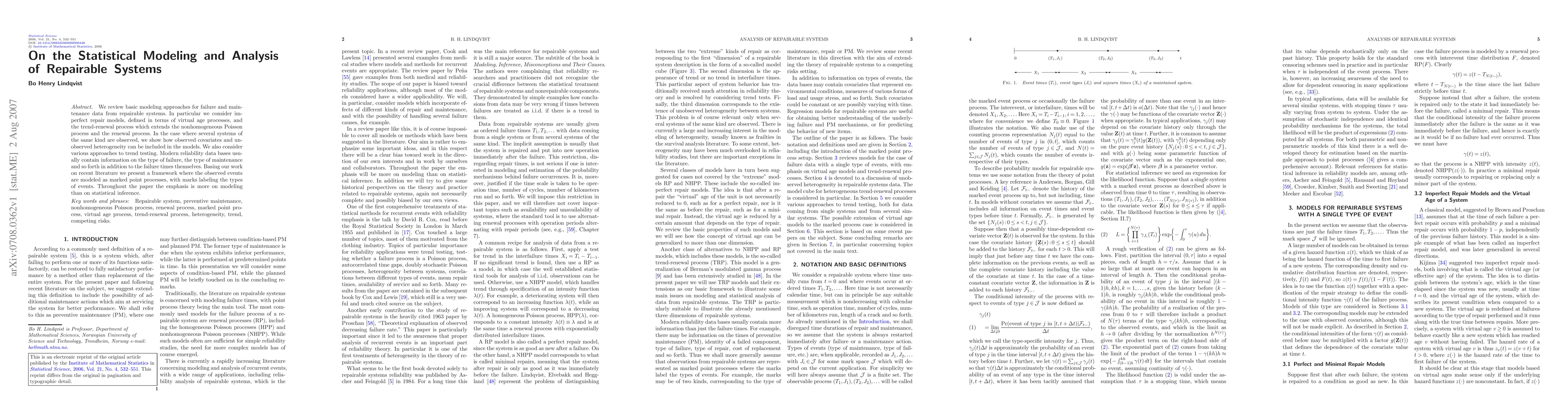 We review basic modeling approaches for failure and maintenance data from repairable systems. In particular we consider imperfect repair models, defined in terms of virtual age processes, and the trend-renewal process which extends the nonhomogeneous Poisson process and the renewal process. In the case where several systems of the same kind are observed, we show how observed covariates and unobserved heterogeneity can be included in the models. We also consider various approaches to trend testing. Modern reliability data bases usually contain information on the type of failure, the type of maintenance and so forth in addition to the failure times themselves. Basing our work on recent literature we present a framework where the observed events are modeled as marked point processes, with marks labeling the types of events. Throughout the paper the emphasis is more on modeling than on statistical inference.