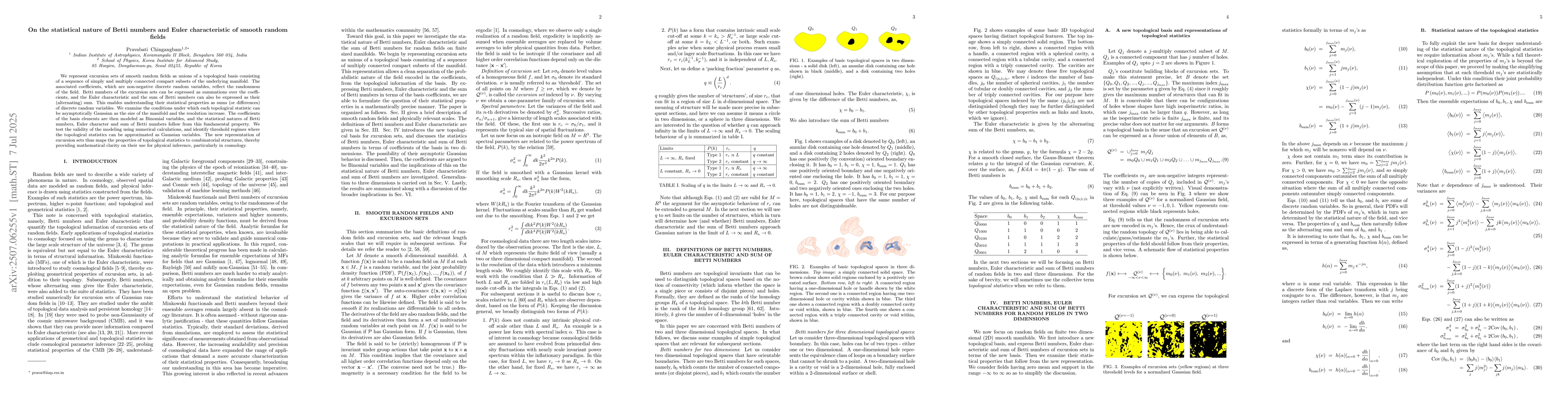 We represent excursion sets of smooth random fields as unions of a topological basis consisting of a sequence of simply and multiply connected compact subsets of the underlying manifold. The associated coefficients, which are non-negative discrete random variables, reflect the randomness of the field. Betti numbers of the excursion sets can be expressed as summations over the coefficients, and the Euler characteristic and the sum of Betti numbers can also be expressed as their (alternating) sum. This enables understanding their statistical properties as sums (or differences) of discrete random variables. We examine the conditions under which each topological statistic can be asymptotically Gaussian as the size of the manifold and the resolution increase. The coefficients of the basis elements are then modeled as Binomial variables, and the statistical natures of Betti numbers, Euler character and sum of Betti numbers follow from this fundamental property. We test the validity of the modeling using numerical calculations, and identify threshold regimes where the topological statistics can be approximated as Gaussian variables. The new representation of excursion sets thus maps the properties of topological statistics to combinatorial structures, thereby providing mathematical clarity on their use for physical inference, particularly in cosmology.