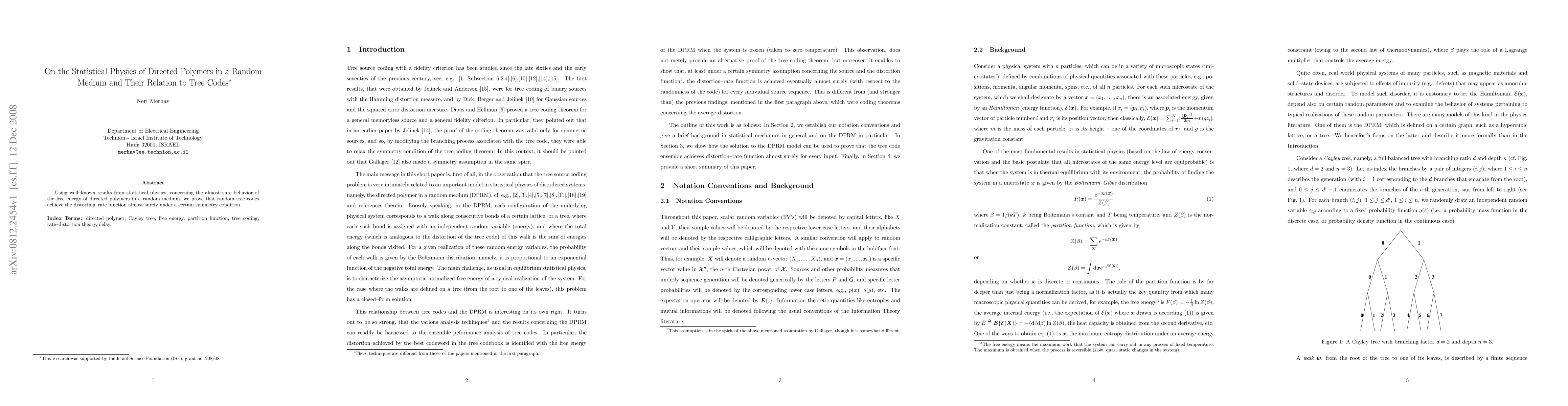 Researchers prove that random tree codes achieve optimal distortion-rate function behavior almost surely when a certain symmetry condition is met, building on statistical physics principles for directed polymers in a random medium.