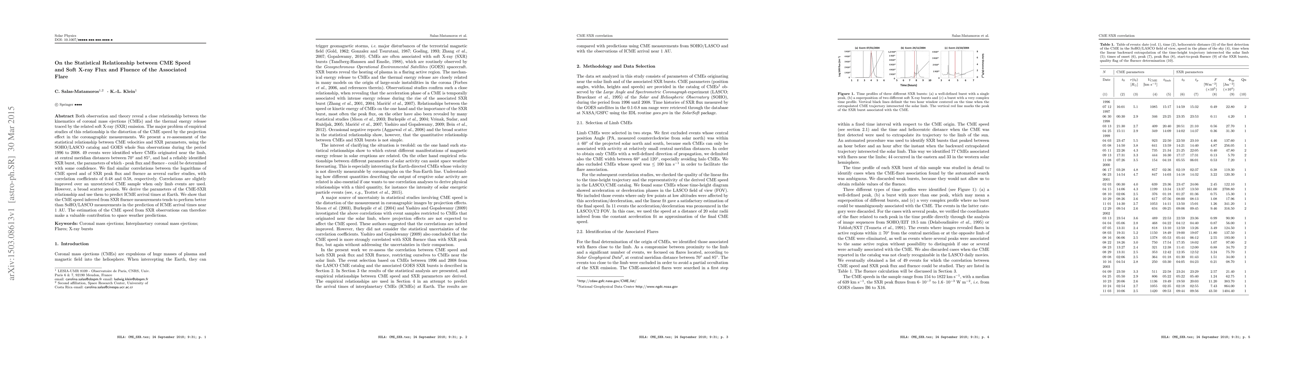 This paper investigates the statistical relationship between coronal mass ejection (CME) speeds and the soft X-ray (SXR) flux and fluence of associated flares, using data from 1996 to 2008. It finds correlations between CME speed and SXR parameters, with slightly improved results for limb events, and suggests that SXR fluence measurements can better predict ICME arrival times compared to traditional measurements.