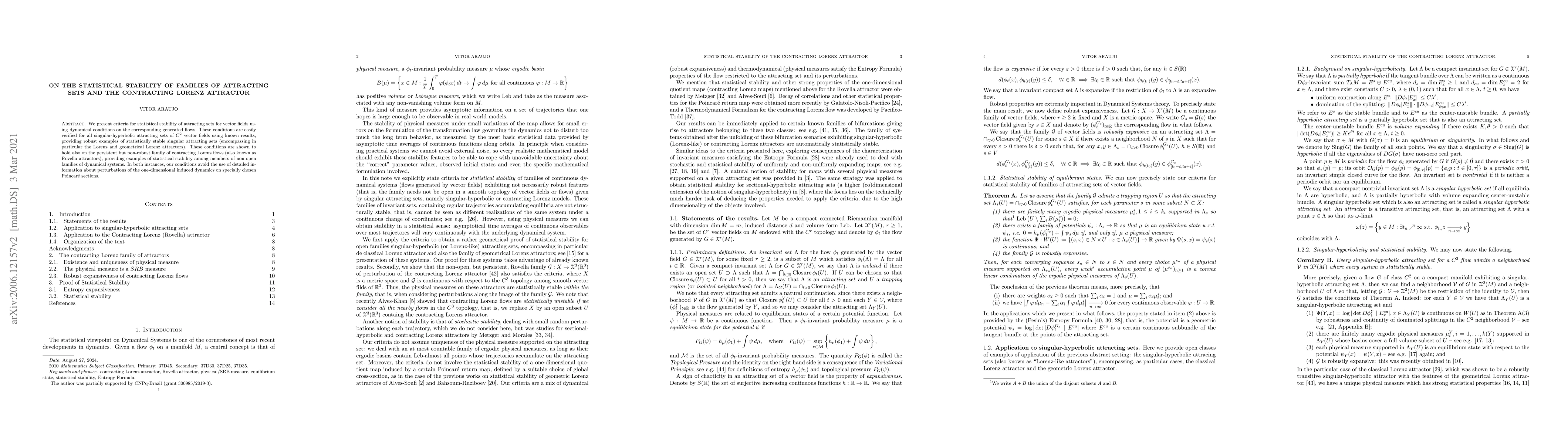 This paper establishes criteria for statistical stability of attracting sets in vector fields, demonstrating their application to singular-hyperbolic sets and the persistent but non-robust contracting Lorenz attractors. The criteria require only dynamical conditions and avoid detailed knowledge of perturbations on Poincaré sections.