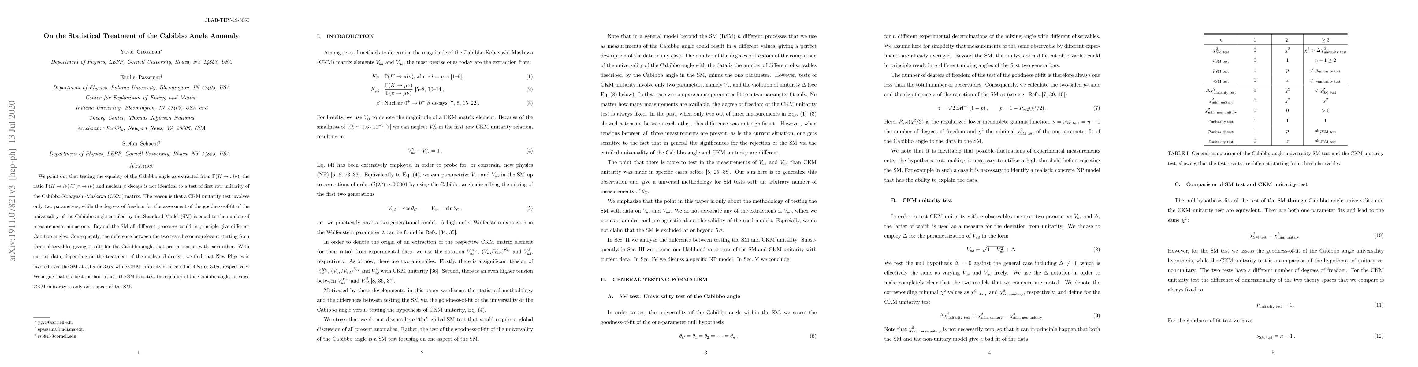 This paper discusses the distinction between testing the equality of the Cabibbo angle across different decay processes and testing the unitarity of the Cabibbo-Kobayashi-Maskawa (CKM) matrix. It finds that while CKM unitarity is rejected at $4.8\,\sigma$ or $3.0\,\sigma$, New Physics is favored over the Standard Model at $5.1\,\sigma$ or $3.6\,\sigma$, suggesting that testing the equality of the Cabibbo angle may be a better method to probe the Standard Model.