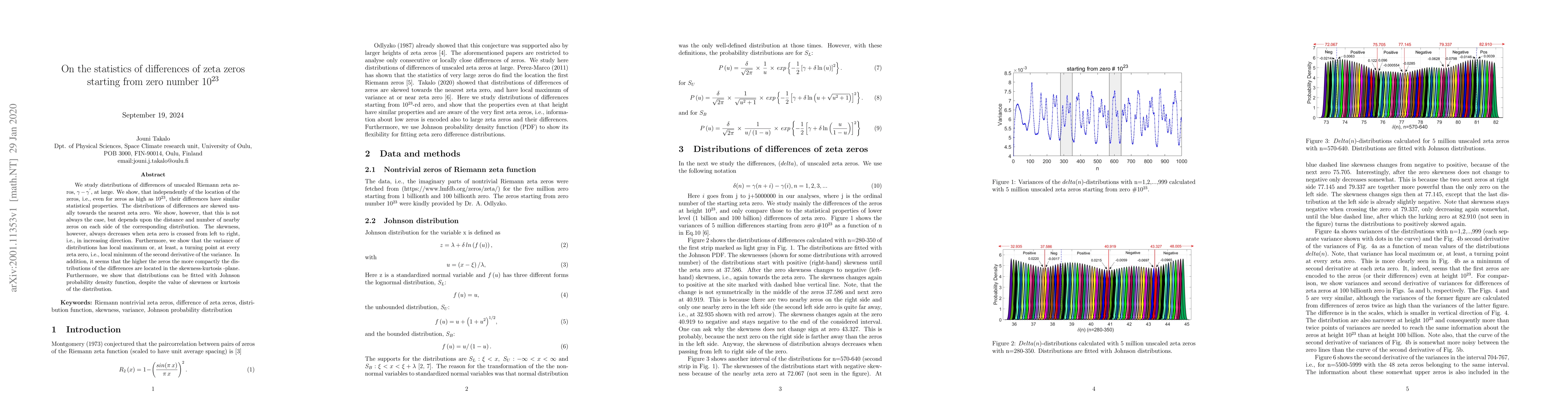 This paper investigates the statistical properties of differences between large unscaled Riemann zeta zeros, showing that their distributions are skewed towards the nearest zero and that variance has local maxima at each zero. The study reveals that higher zeta zeros lead to more compact distributions, which can be modeled using a Johnson probability density function.